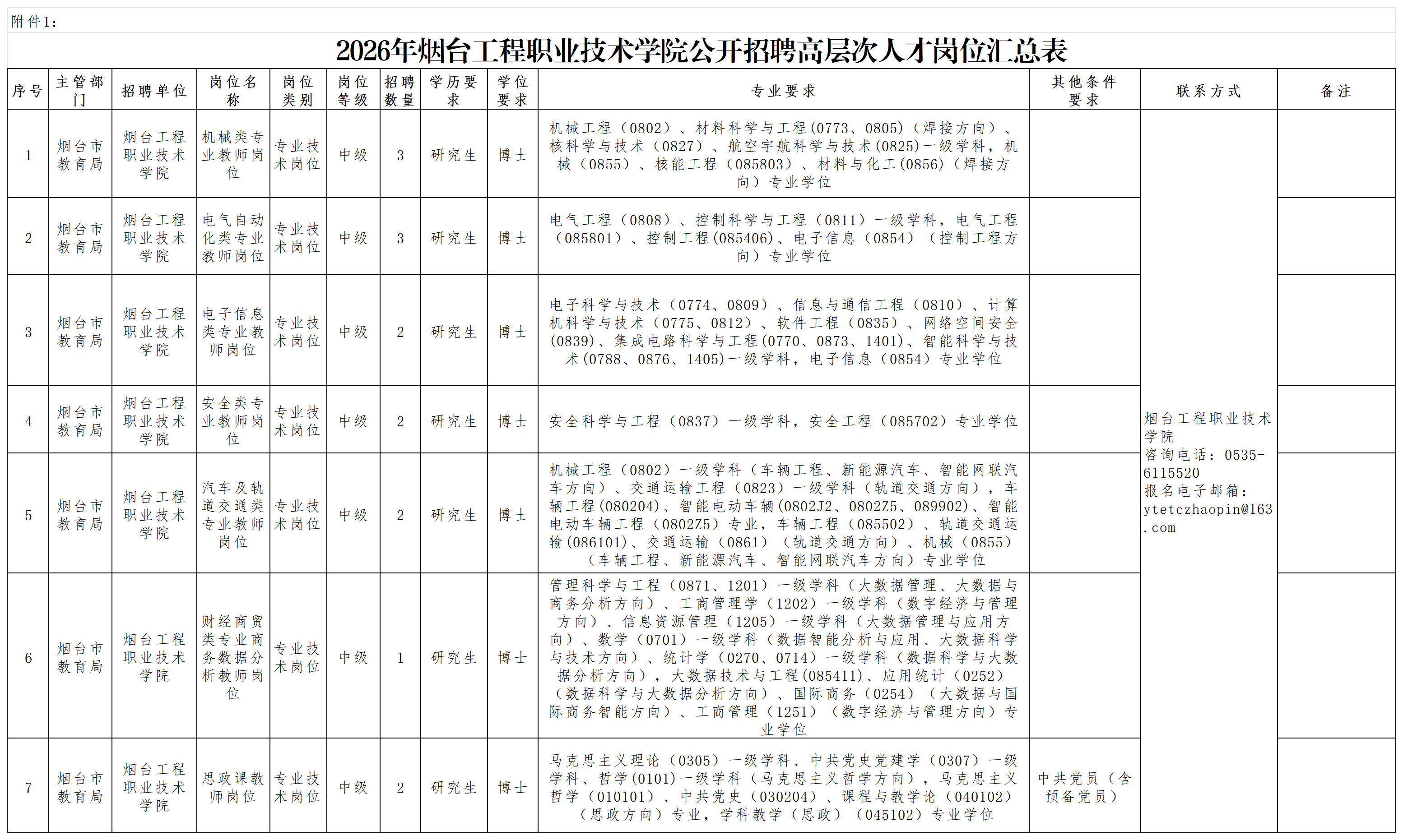 3月18日,烟台工程职业技术学院发布招聘公告,公开招聘15名高层次人才,均要求博士学位,考试形式为直接面试。具体岗位如下: