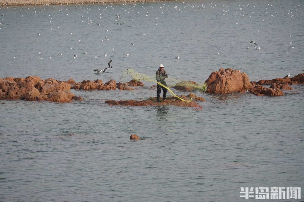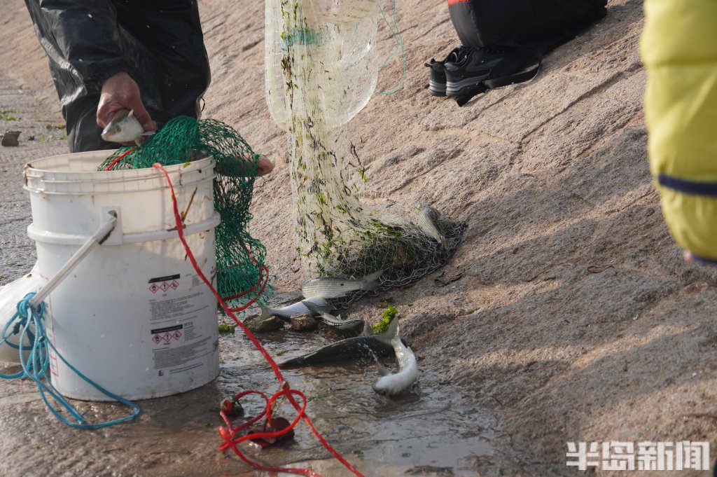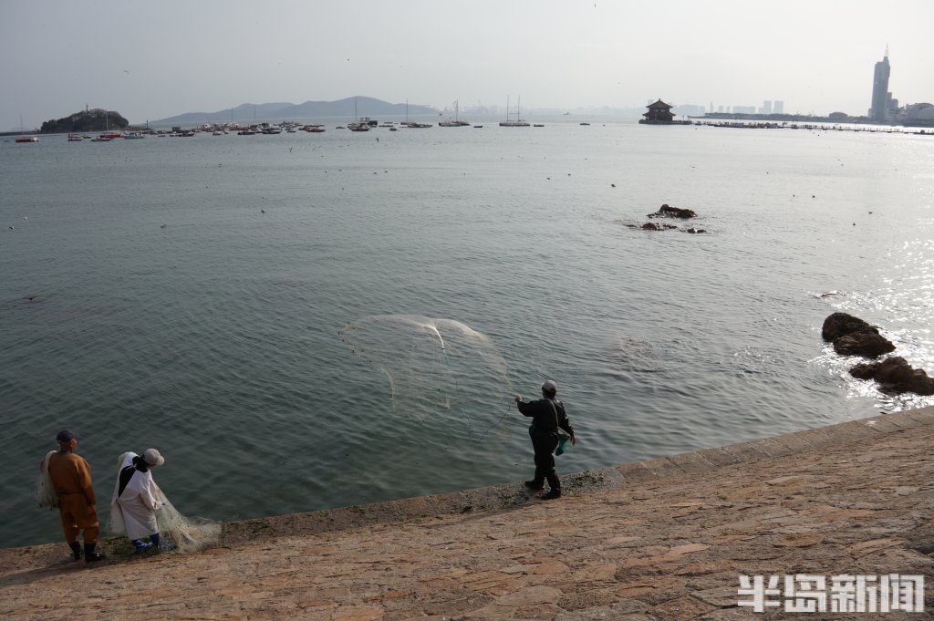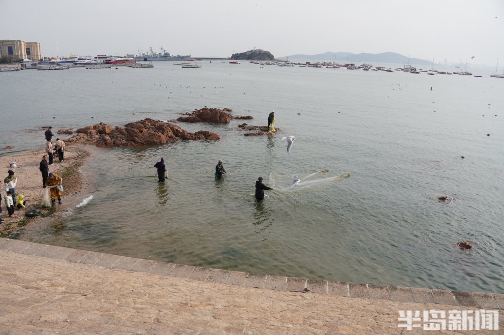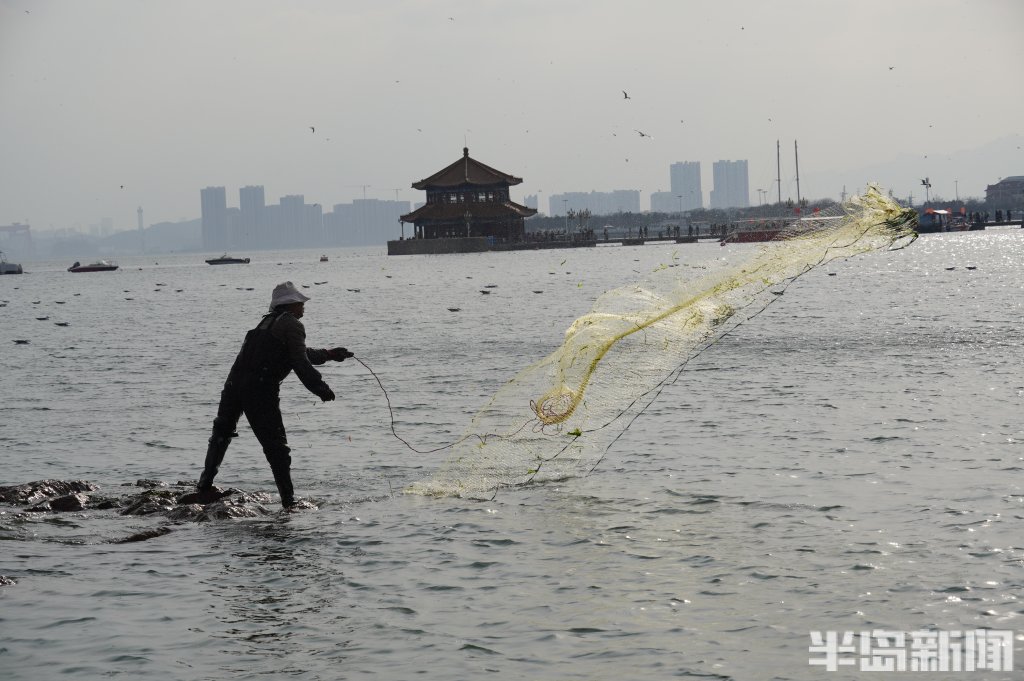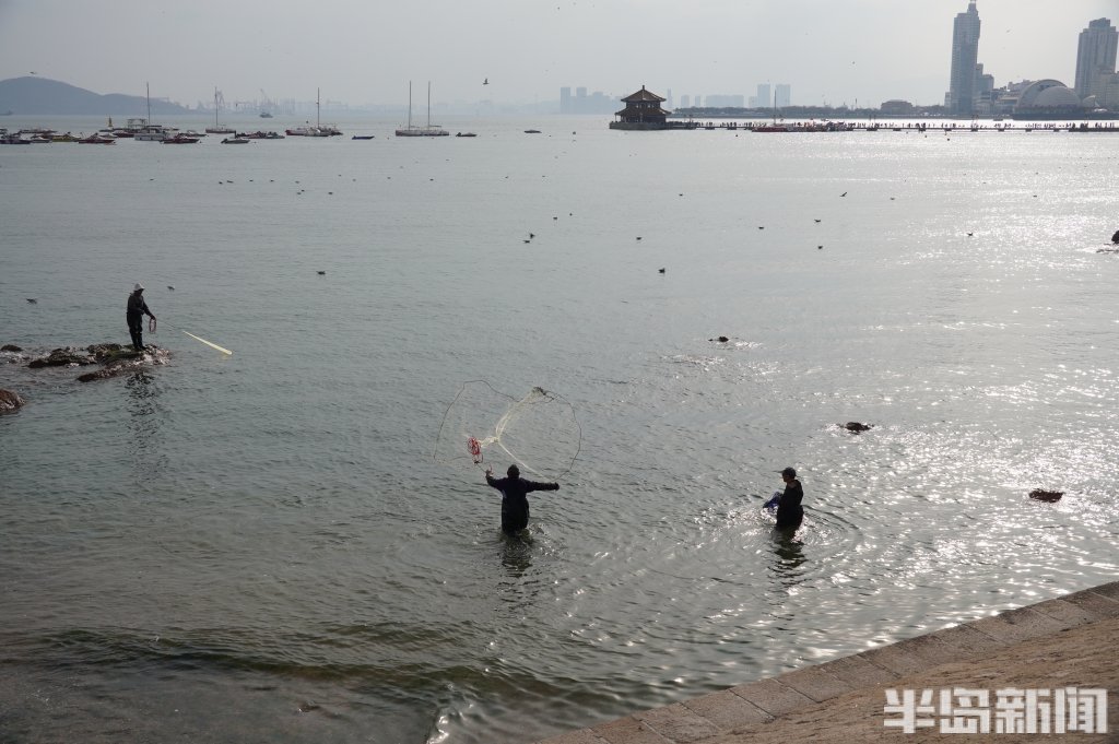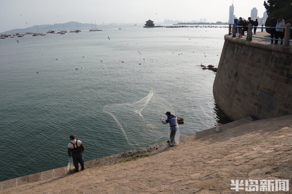 3月18日,一群青岛大爷在前海捕鱼。近日回温,青岛前海梭鱼、鲻鱼扎堆回游近岸。每天涨潮时分,十几位青岛大爷穿着水衣来到前海沿,一展撒网捕鱼绝活,吸引很多游客围观,趣味十足。运气好时一网就能逮住几十条鱼,最大的两三斤重,回家添道美味下酒菜。(半岛全媒体记者黄杰显)