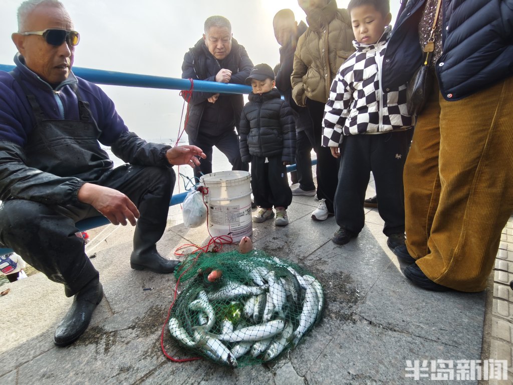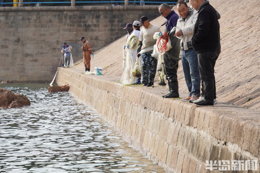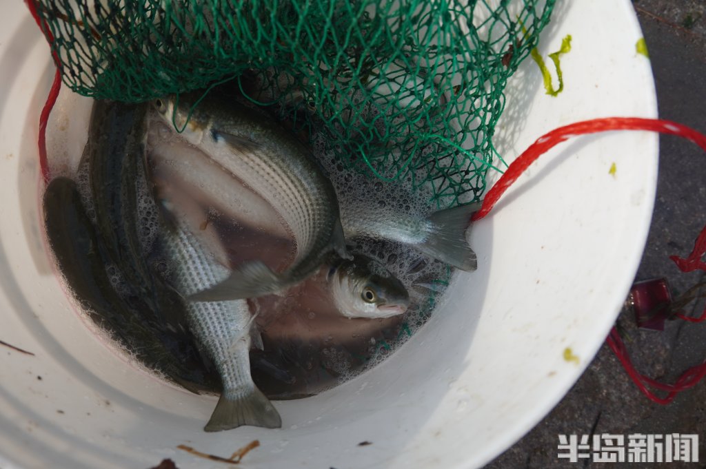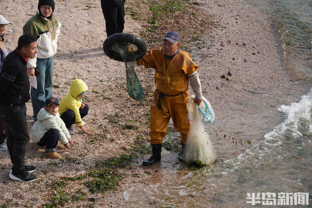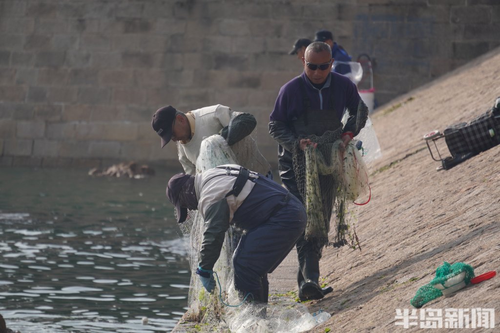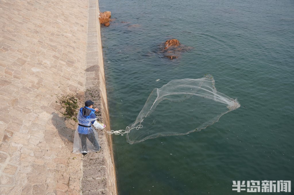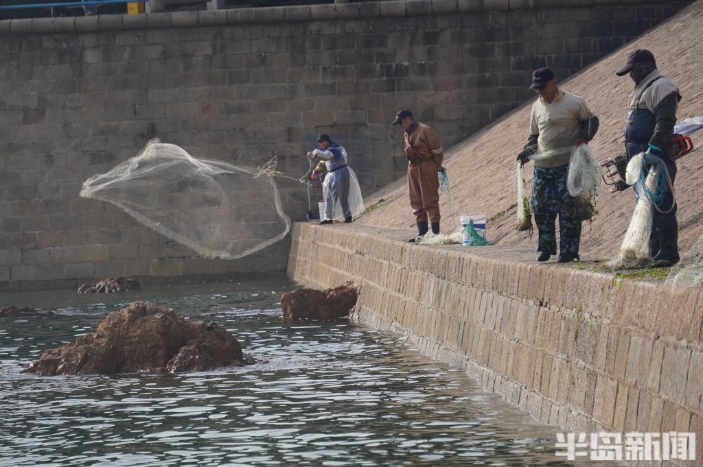 3月18日,一群青岛大爷在前海捕鱼。近日回温,青岛前海梭鱼、鲻鱼扎堆回游近岸。每天涨潮时分,十几位青岛大爷穿着水衣来到前海沿,一展撒网捕鱼绝活,吸引很多游客围观,趣味十足。运气好时一网就能逮住几十条鱼,最大的两三斤重,回家添道美味下酒菜。(半岛全媒体记者黄杰显)