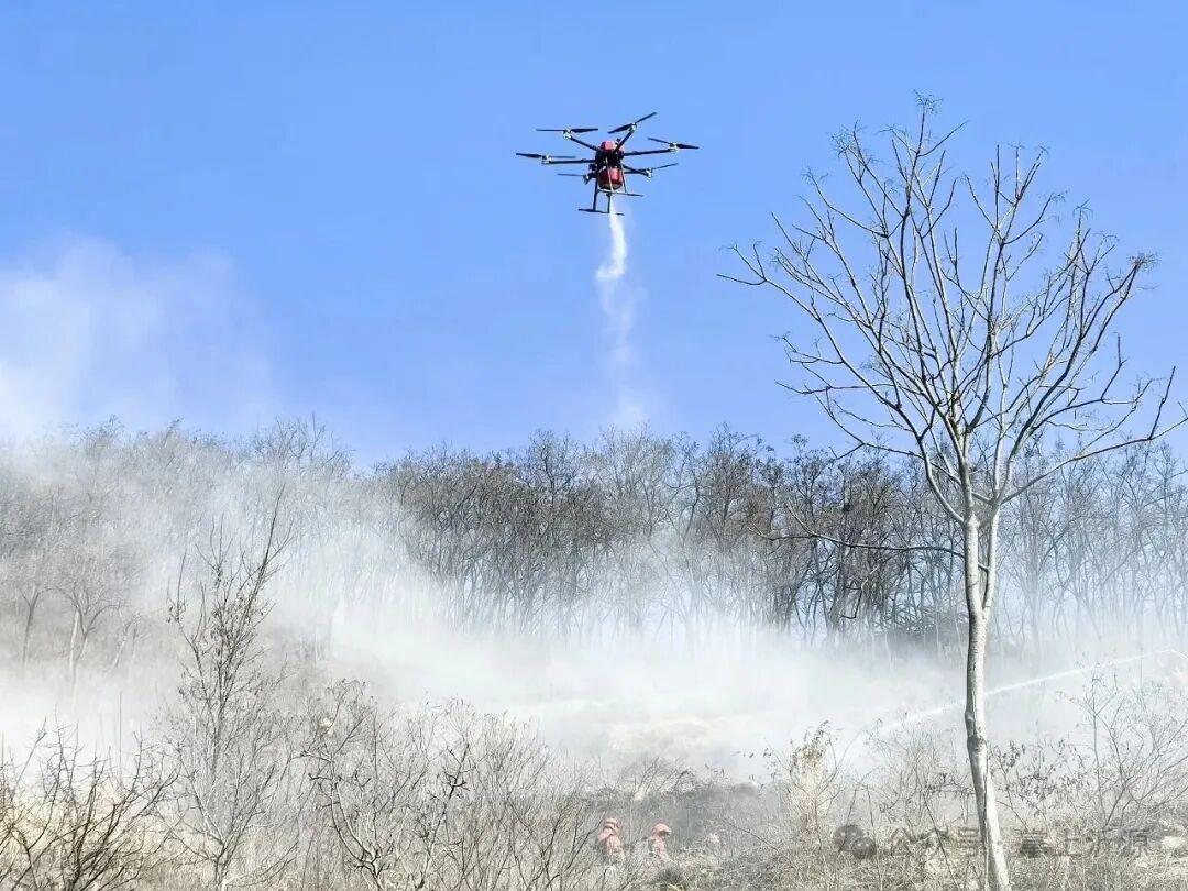 面对模拟的悬崖火、树冠火等复杂情况,高科技灭火装备大显神威。干粉喷射无人机升空实施高空压制,水带吊装无人机精准覆盖零星火点。与此同时,桓台县消防救援局的专业队伍驾驶消防水罐车,与水泵协同作业,在地面与半空构筑起立体水幕,空地协同实现快速控火。