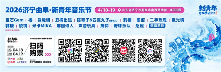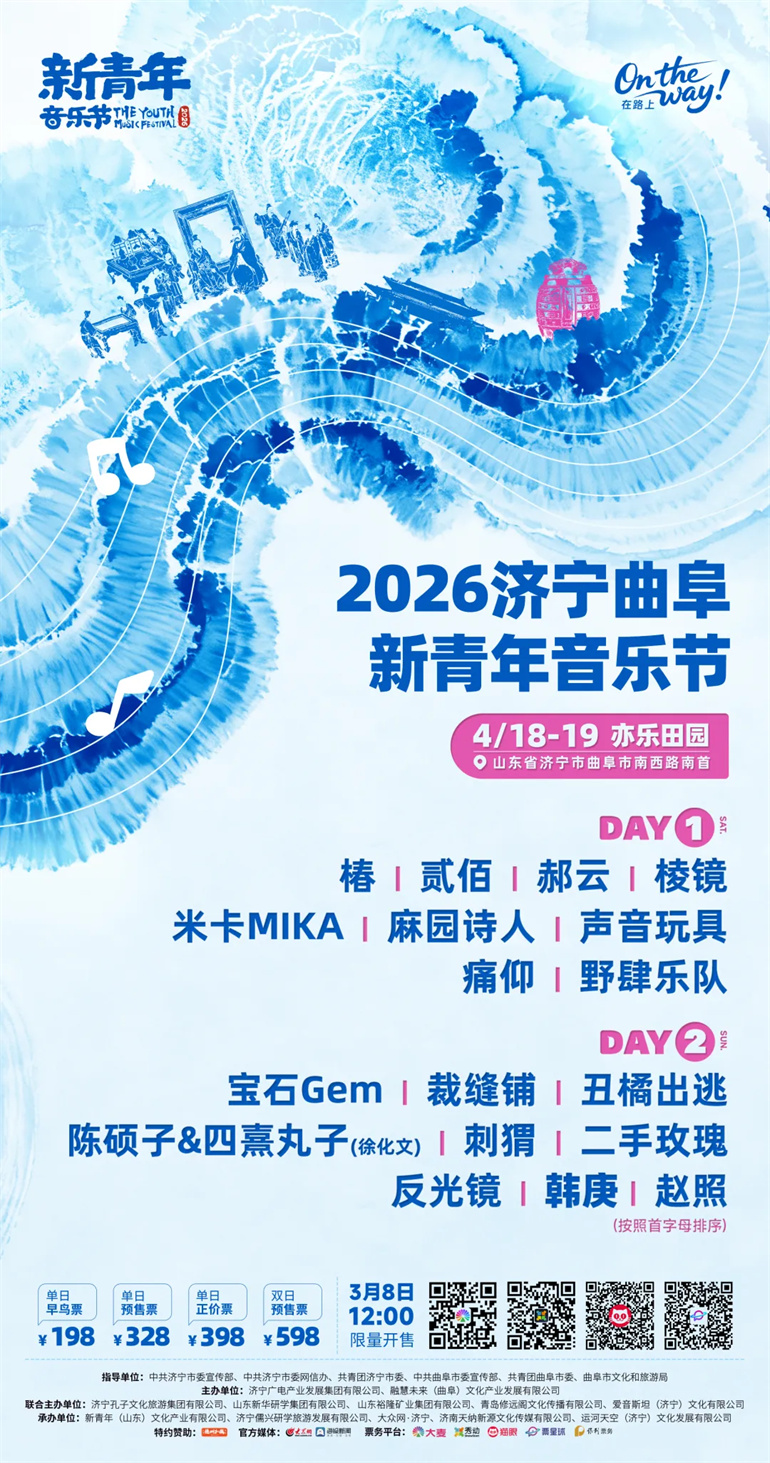 2026济宁曲阜·新青年音乐节由中共济宁市委宣传部、共青团济宁市委、中共曲阜市委宣传部、共青团曲阜市委、曲阜市文化和旅游局指导,济宁广电产业发展集团有限公司、融慧未来(曲阜)文化产业发展有限公司主办,济宁孔子文化旅游集团有限公司、山东新华研学集团有限公司、山东裕隆矿业集团有限公司、青岛修远阁文化传播有限公司、爱音斯坦(济宁)文化有限公司联合主办,新青年(山东)文化产业有限公司、济宁儒兴研学旅游发展有限公司、大众网·济宁、济南天纳新源文化传媒有限公司、运河天空(济宁)文化发展有限公司承办,中国禽类制品高端品牌——德州扒鸡®特约赞助。两天时间,18支乐队/歌手齐聚济宁市曲阜市亦乐田园,远方朋来,礼乐相迎。新青年,On the way,此站济宁曲阜,我们现场见。