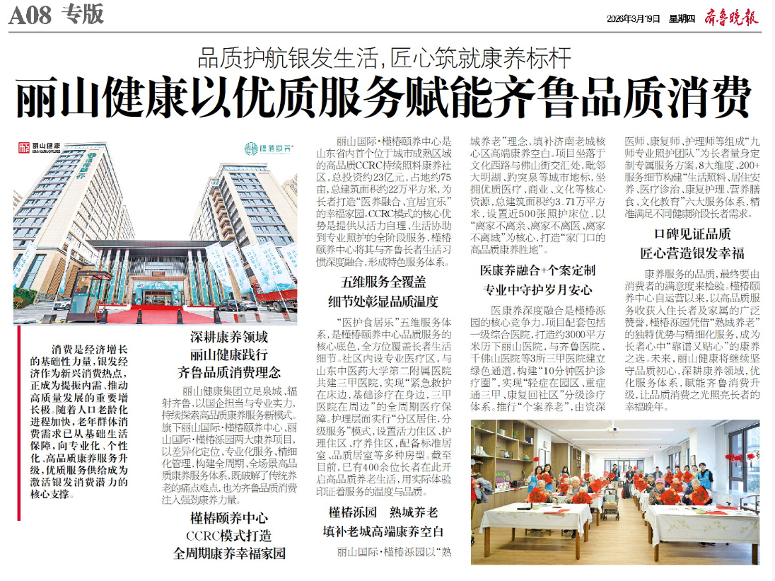 丽山健康集团立足泉城、辐射齐鲁,以国企担当与专业实力,持续探索高品质康养服务新模式。旗下丽山国际·槿椿颐养中心、丽山国际·槿椿泺园两大康养项目,以差异化定位、专业化服务、精细化管理,构建全周期、全场景高品质康养服务体系,既破解了传统养老的痛点难点,也为齐鲁品质消费注入强劲康养力量。