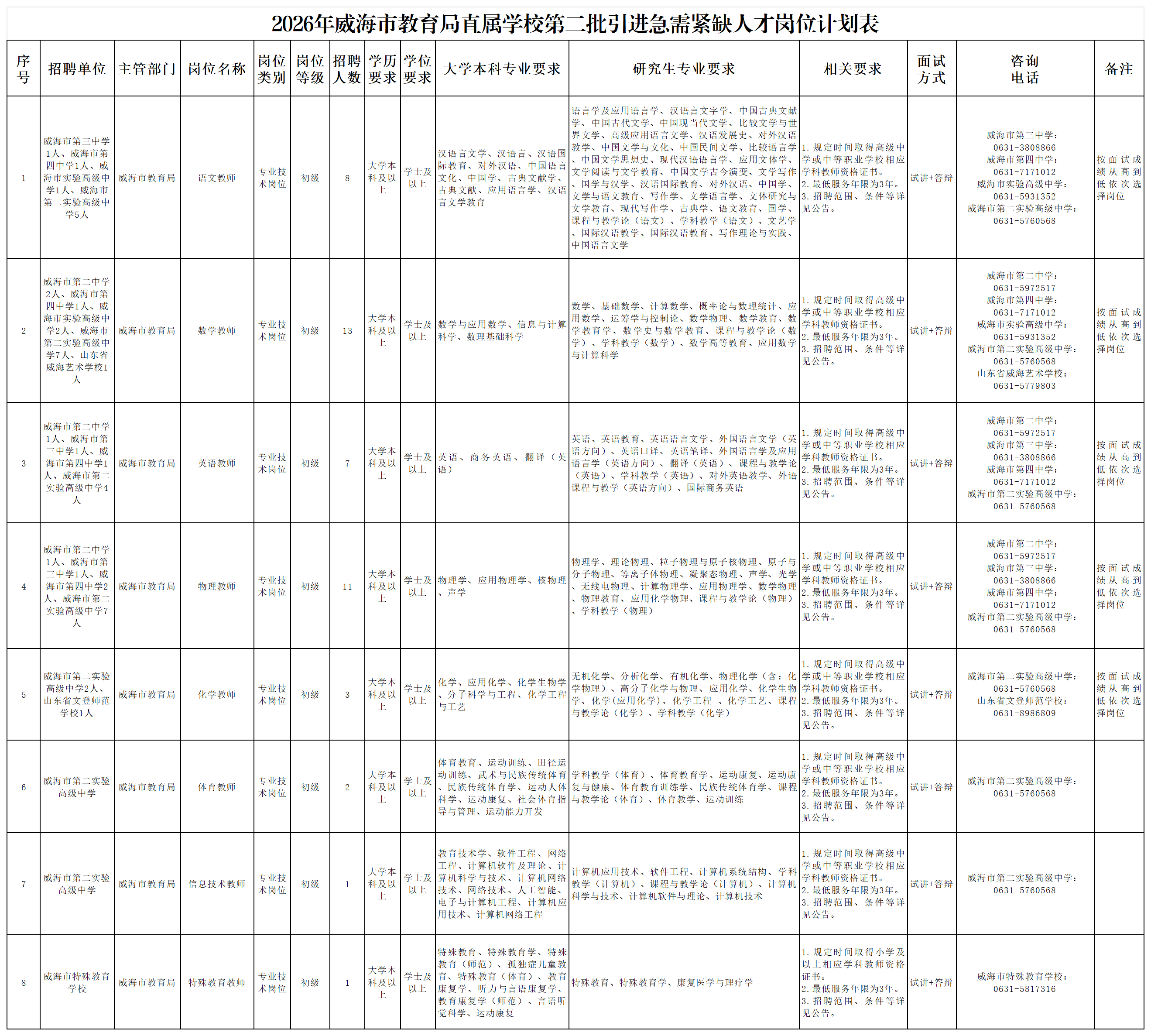 本次岗位计划及具体条件详见《2026年威海市教育局直属学校第二批引进急需紧缺人才岗位计划表》。