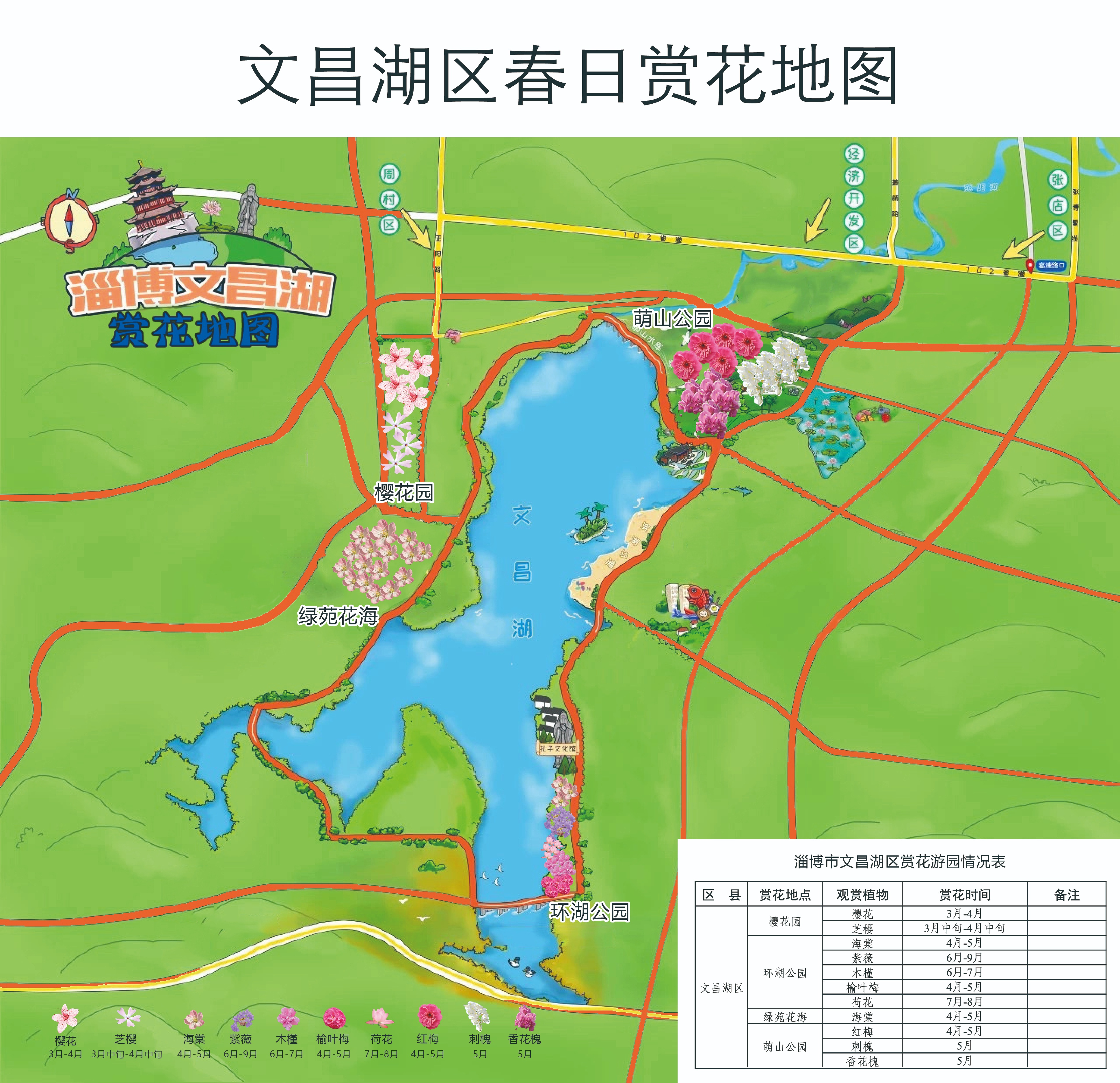 齐鲁第一湖,水上花园。文昌湖区在萌山公园、樱花园等4处点位,选取了樱花、海棠、紫薇、红梅等10种植物。环湖路旁,花树夹道,湖光山色与繁花相映成趣。