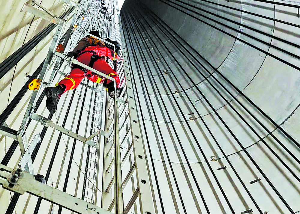 现场绳索与装备不匹配,周生印和队友迅速改造绳索,用滑轮组搭建固定保护系统。“绳索七八十斤重,平时用来拉电缆,当时只能临时改造固定伤者。”周生印为伤者穿戴好防护装备,将其背在身上,沿爬梯逐级向下转移。