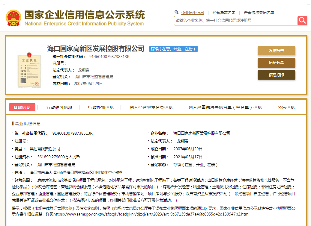 国家企业信用信息公示显示,海口国家高新区发展控股有限公司成立于2007年,注册资本561899.2796万元。其官网显示,公司主要业务涵盖高新区基础设施建设、产业配套设施开发建设及招商运营、物业服务、安居房及人才房建设与销售、市政府项目代建及投融资等。