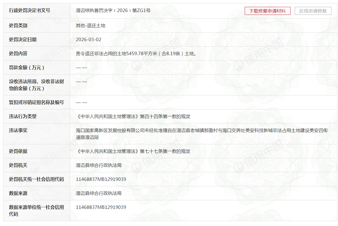 日前,信用中国公示了海口国家高新区发展控股有限公司的行政处罚决定。行政处罚决定书文号澄迈综执普罚决字﹝2026﹞第ZG1号显示,海口国家高新区发展控股有限公司未经批准擅自在澄迈县老城镇那盈村与海口交界处美安科技新城非法占用土地建设美安四街道路澄迈段。依据《中华人民共和国土地管理法》第七十七条第一款的规定,澄迈县综合行政执法局责令退还非法占用的土地5459.78平方米(合8.19亩)土地。