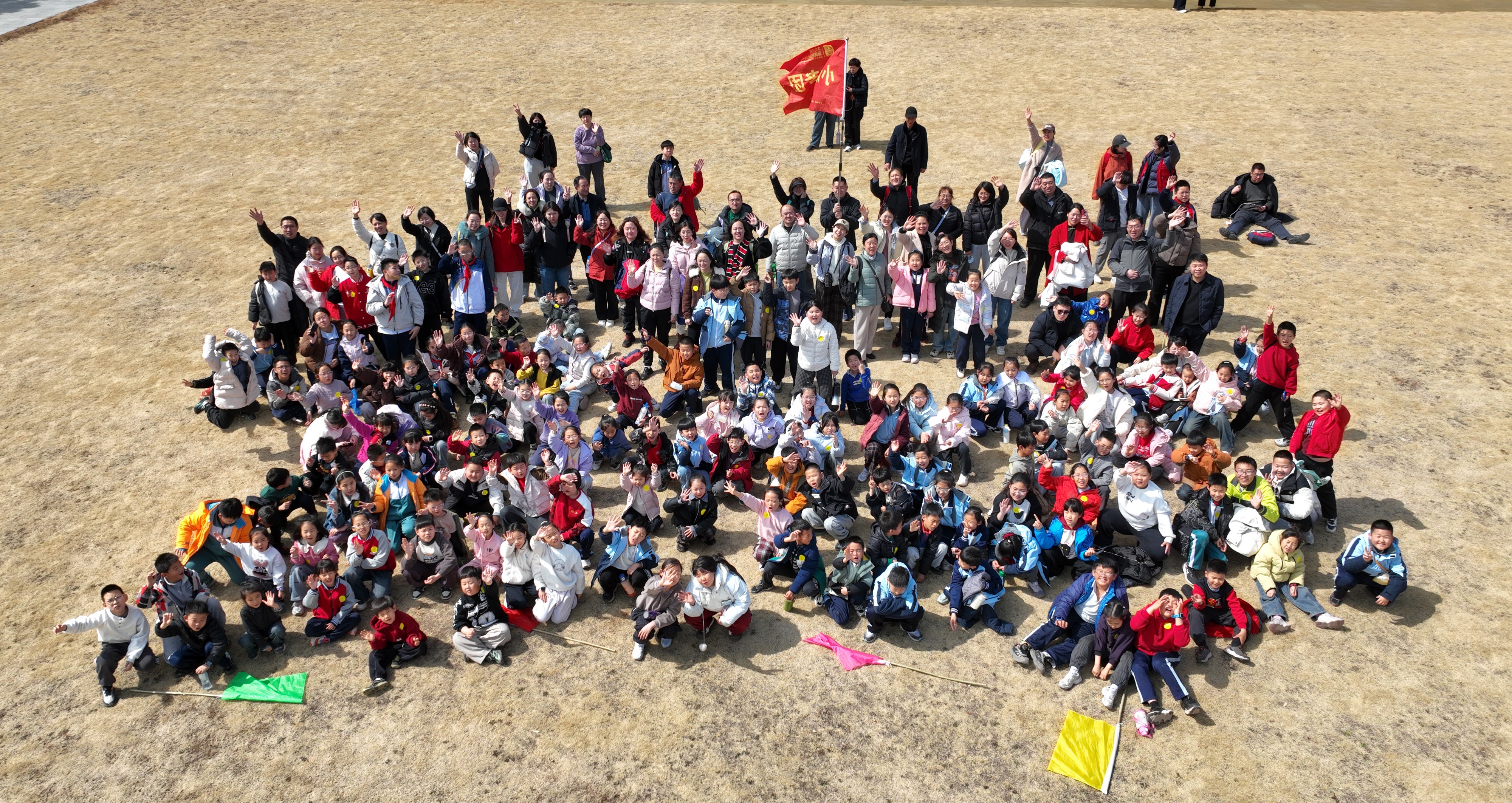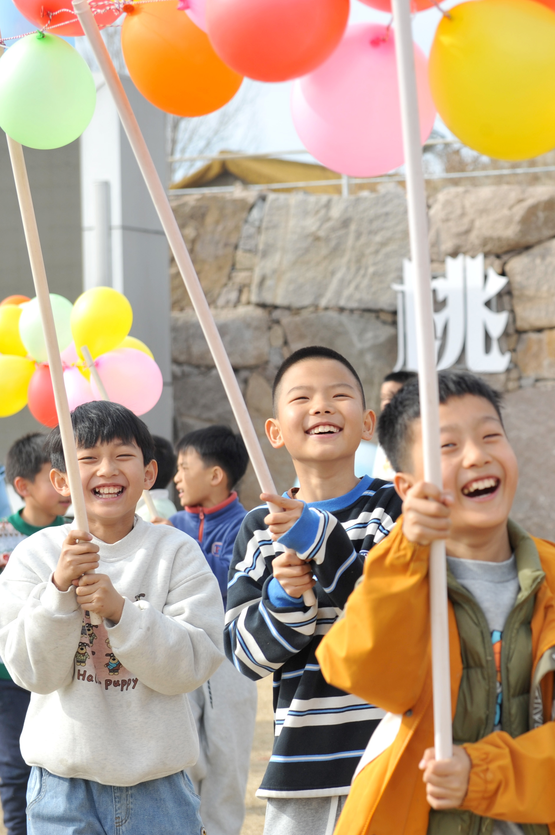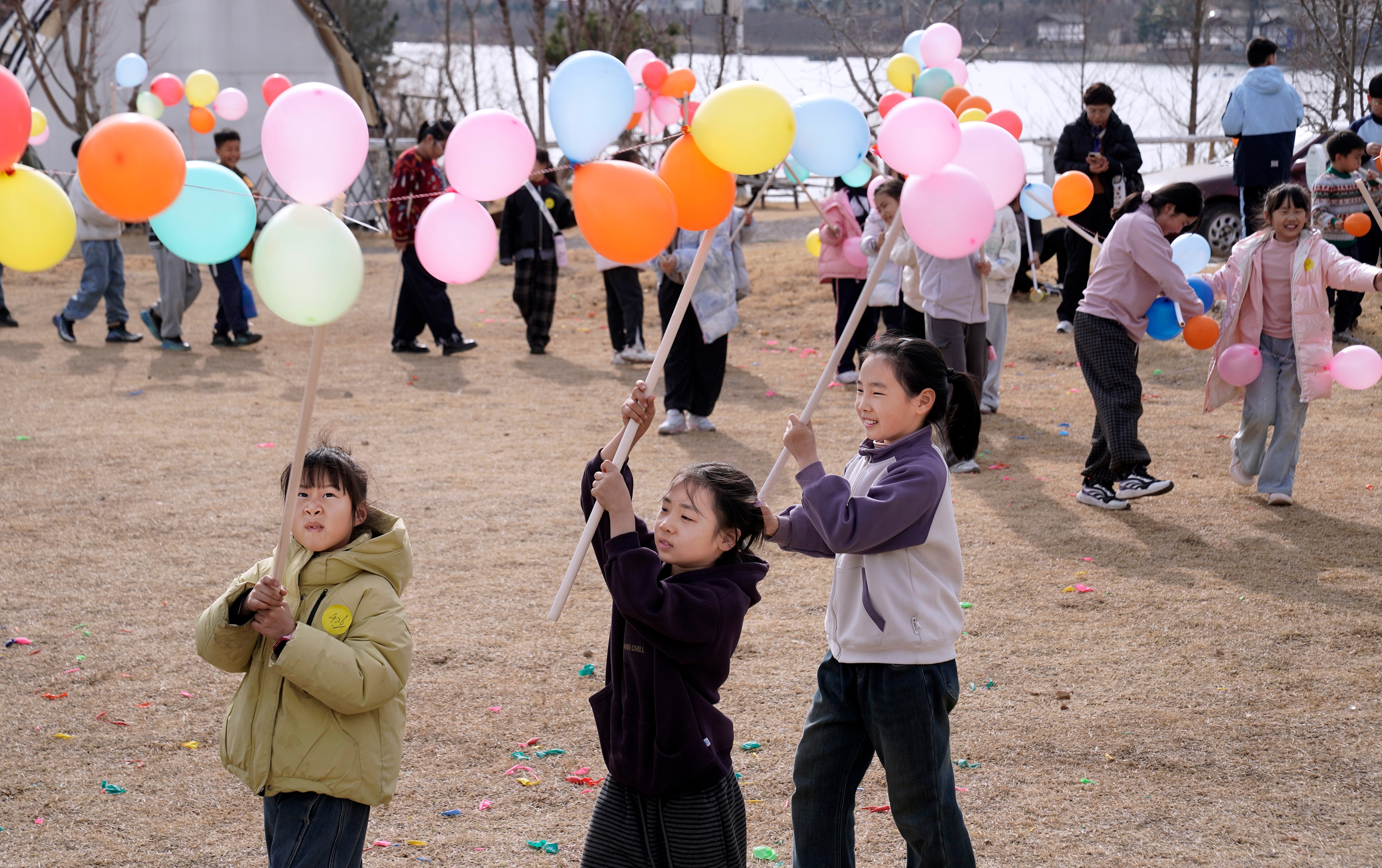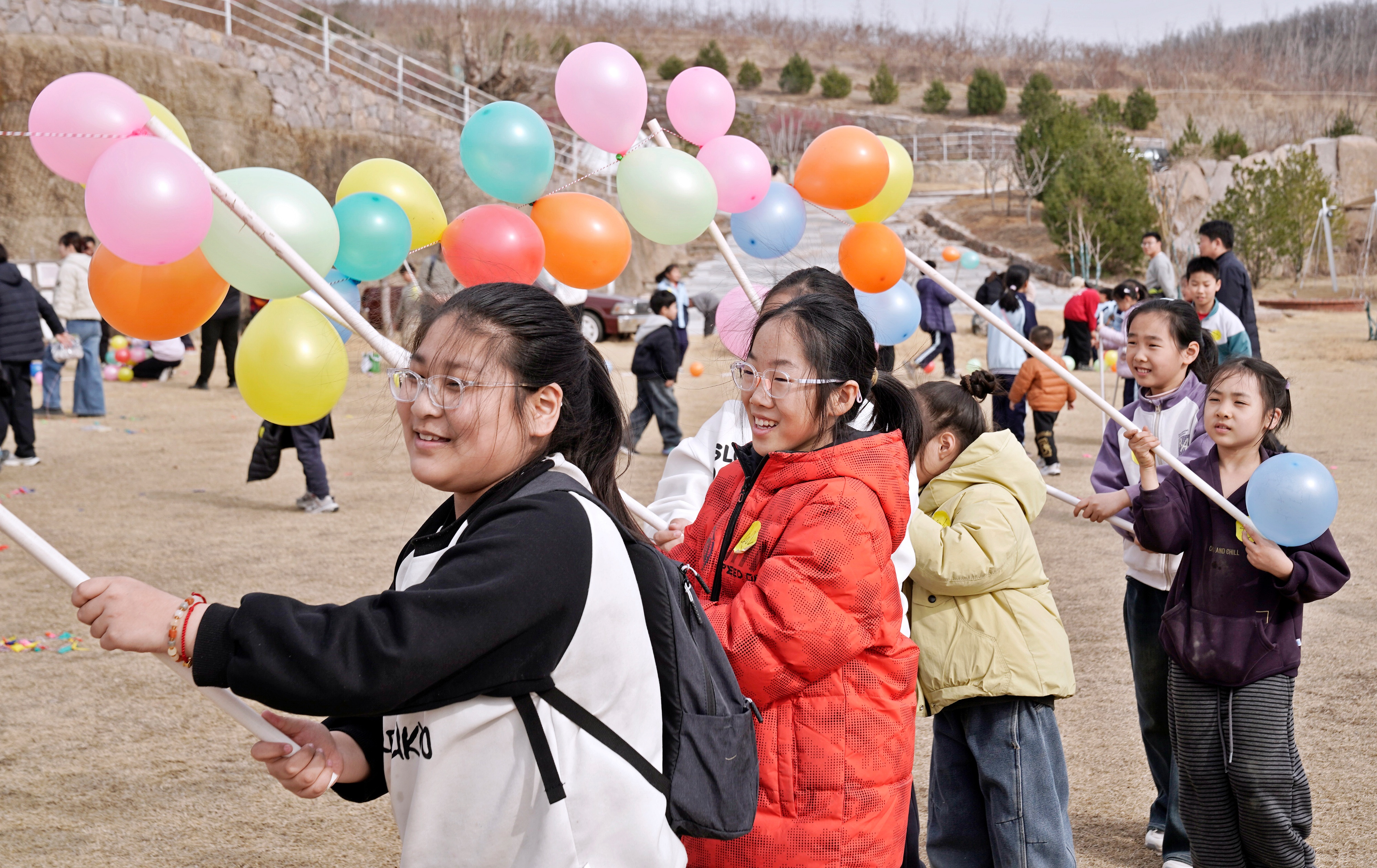 孩子们吹起气球,编成长龙,跟随“领龙人”在春风中奔跑……一条条五彩长龙,穿梭在初春的山野间,仿佛把整个春天都舞动起来了!