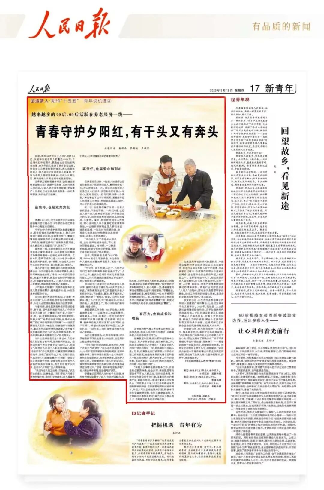 近日,《人民日报》刊发《越来越多的90后、00后活跃在养老服务一线——青春守护夕阳红,有干头又有奔头》报道,以年轻一代养老服务从业者为切入点,聚焦专业服务体系、暖心青春力量、多元养老模式等维度展开讲述,让德达集团旗下这座充满温度的养老示范城,走进了全国视野。