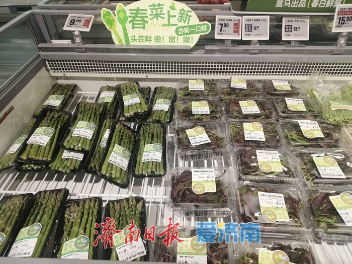 不少超市都专门设置了春菜专区。在济南一家盒马鲜生超市,芦笋头200克装售价9.9元,红香椿被分装在精致的小盒里,100克标价7.99元。虽然价格比菜市场高出不少,但包装整洁、规格统一,吸引了许多年轻顾客的目光。