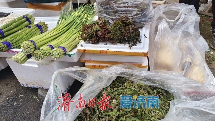 早上八点,记者来到市中区舜玉小区的菜市场。市场里人来人往,蔬菜摊位前绿意盎然,空气中弥漫着野菜特有的清香。