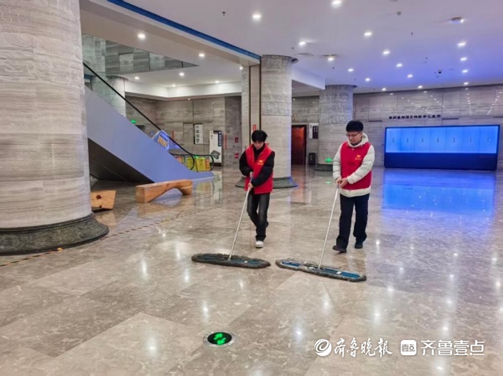 活动中,志愿者们分工协作,迅速投入到展厅环境维护工作中。大家手持抹布、拖把等清洁工具,认真擦拭展柜玻璃、清理地面卫生,对展柜边角、地面拐角等易积灰区域进行细致清理,不放过任何一处卫生死角。志愿者们俯身弯腰、耐心打扫,用实际行动为前来参观的游客营造整洁、舒适的参观环境,也在劳动实践中展现了青年志愿者积极向上的精神风貌。