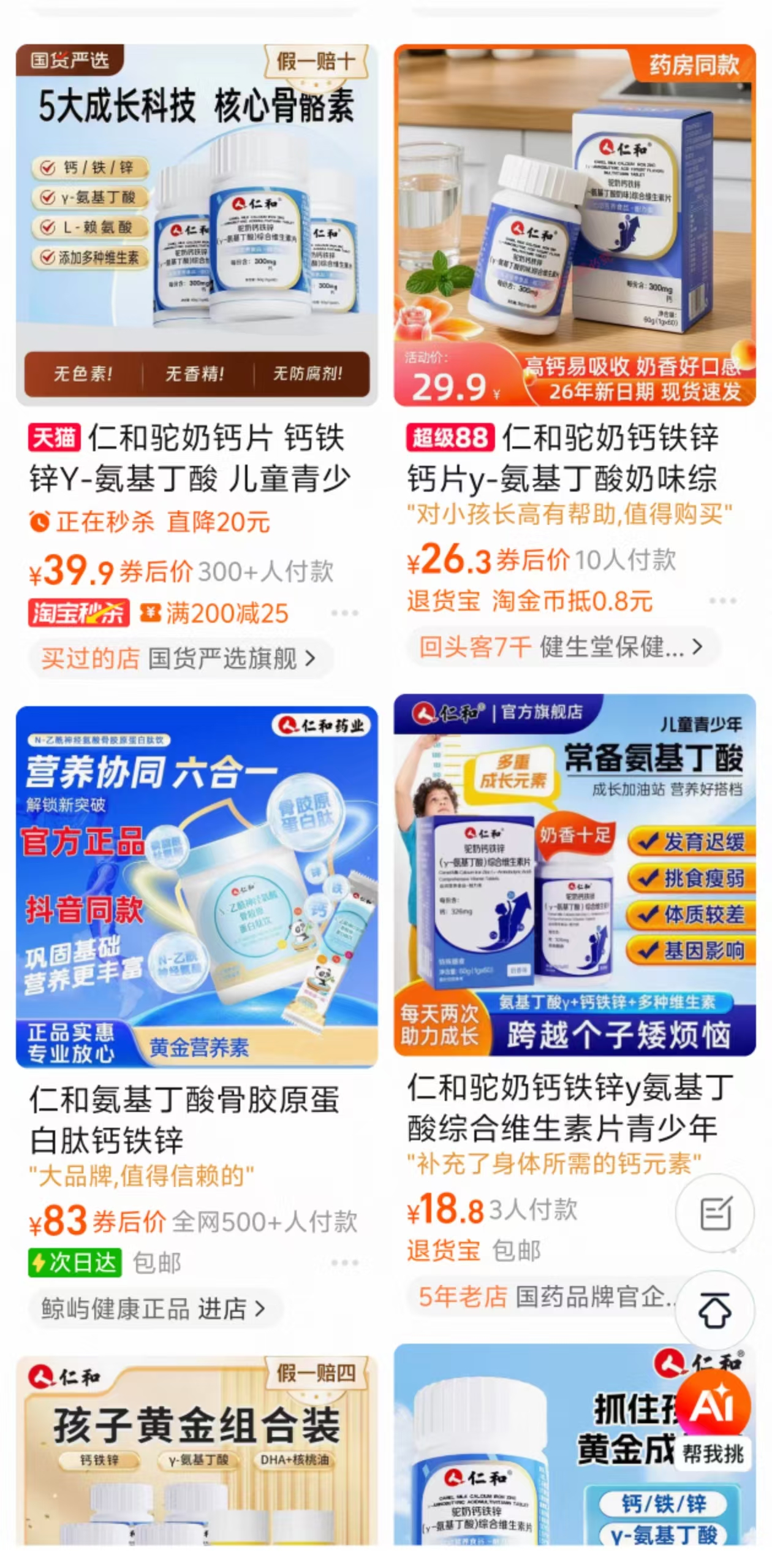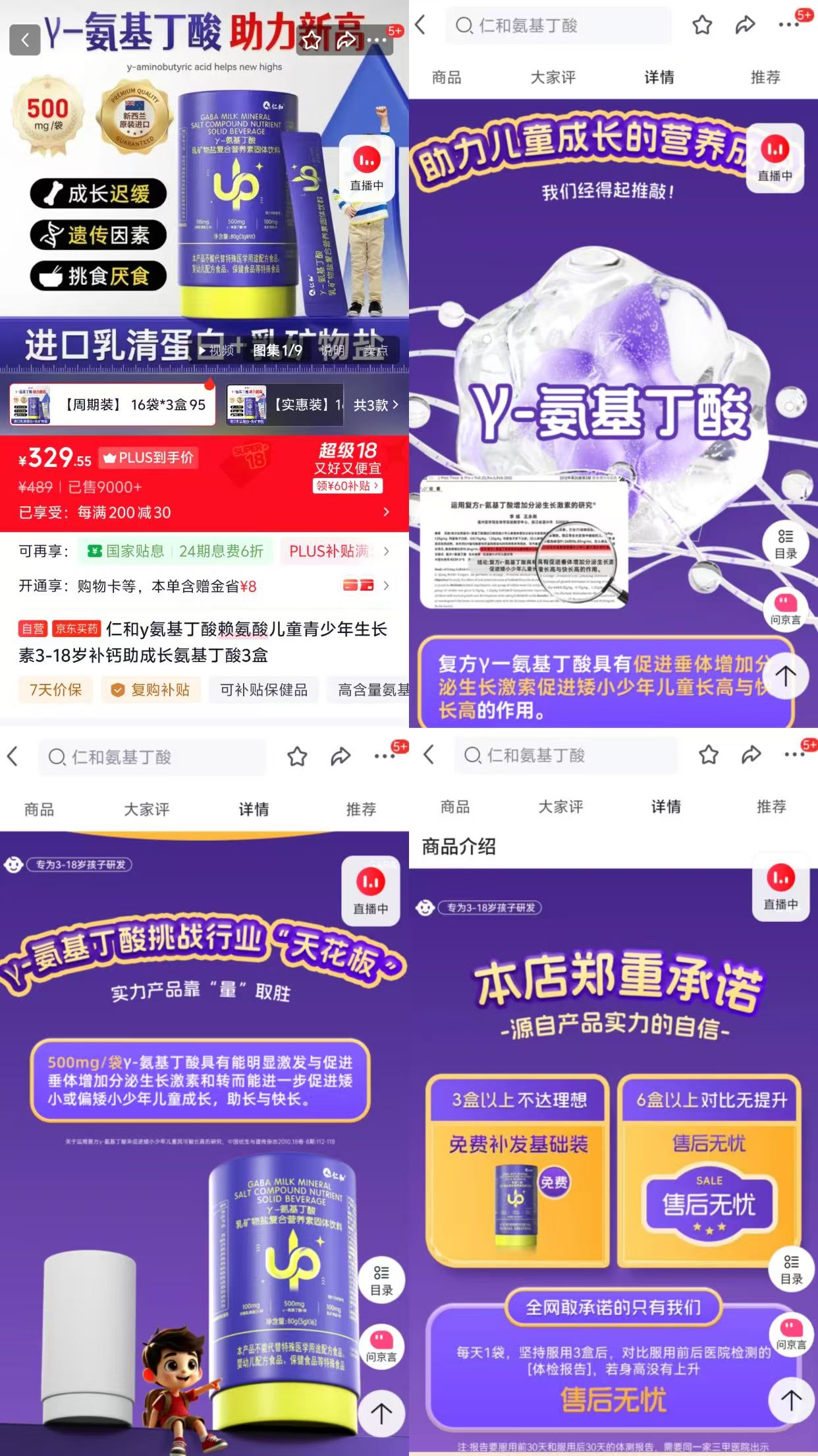 3月17日、18日,壹点“美·育”消费权益守护站记者在多个电商平台检索发现,多款标称“仁和”的γ-氨基丁酸相关产品仍在正常销售,售价从几十元到数百元不等。部分产品页面仍在使用“个子噌噌长”“助力新高度”等话术,或引用γ-氨基丁酸“促进生长激素分泌”的研究文献,隐晦地与儿童身高发育强关联。