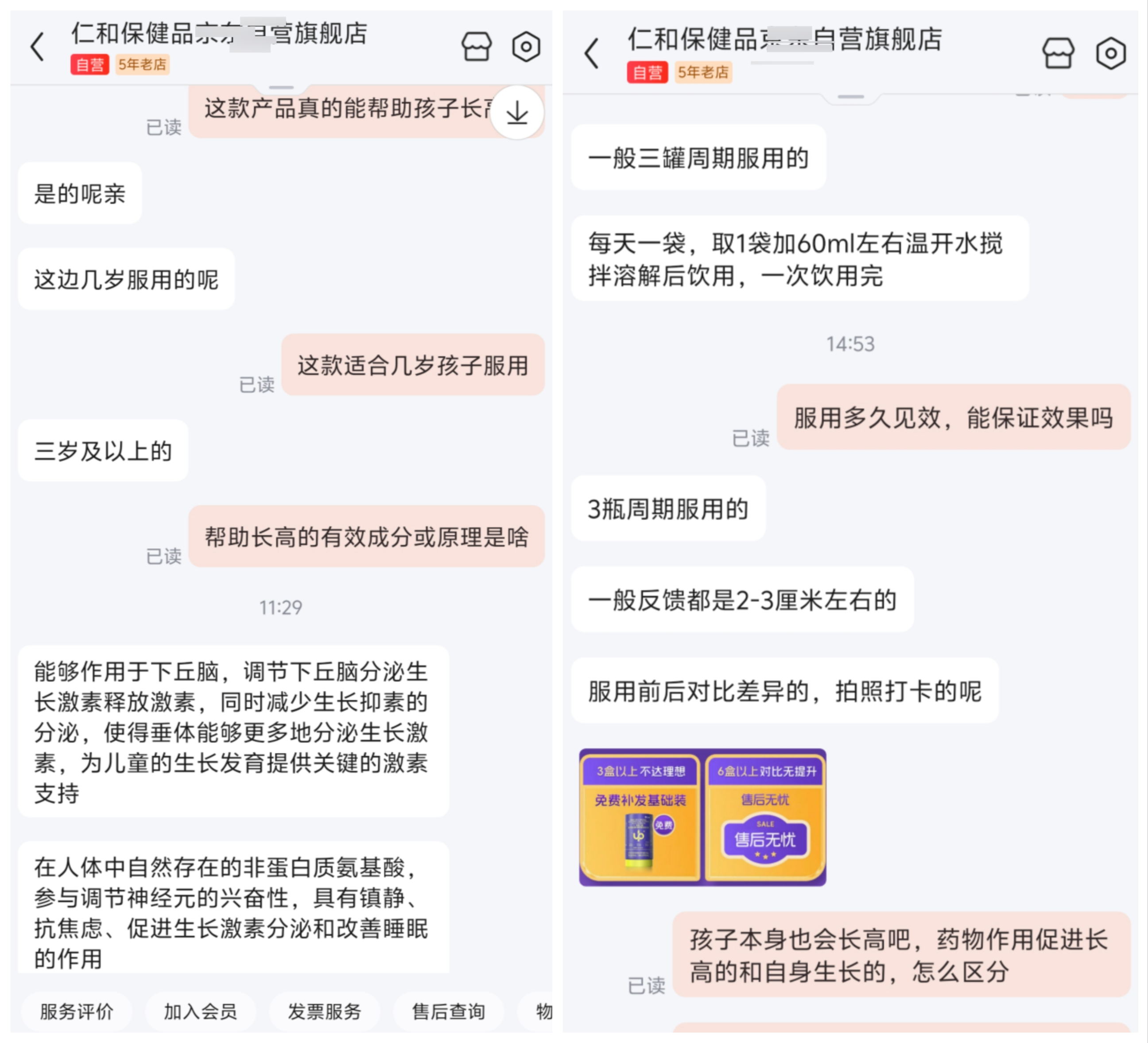 该客服明确向记者表示,这款产品确实能帮助孩子长高,并详细阐述所谓 “原理”,称其能作用于下丘脑调节生长激素释放激素分泌、减少生长抑素分泌,进而让垂体分泌更多生长激素,还声称 γ- 氨基丁酸具有镇静、抗焦虑、促进生长激素分泌和改善睡眠的作用。在效果方面,客服直言 “3 瓶周期服用,一般反馈能长 2-3 厘米”,并发送售后承诺图片,显示购买 3 盒以上若不达理想效果可免费补发基础装,6 盒以上若身高无提升则 “售后无忧”。