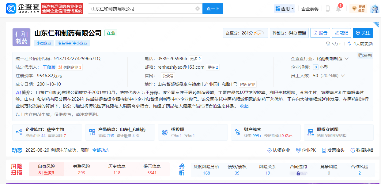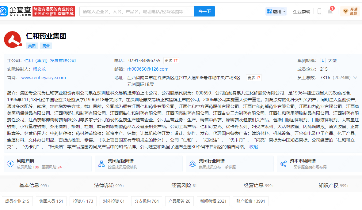 记者通过企查查等公开信息查询核实,“江西仁和”与“山东仁和”为两家完全独立、互不隶属的医药企业。其中,山东仁和制药有限公司成立于 2001 年 10 月,总部位于山东省临沂市郯城县,专注医药制造领域,核心产品为甲钴胺胶囊、利巴韦林颗粒等药品;江西仁和药业集团母公司为仁和药业股份有限公司,是深圳证券交易所挂牌上市公司,总部位于江西省樟树市,旗下拥有二十余家子公司,业务覆盖医药生产、保健品等多个领域。