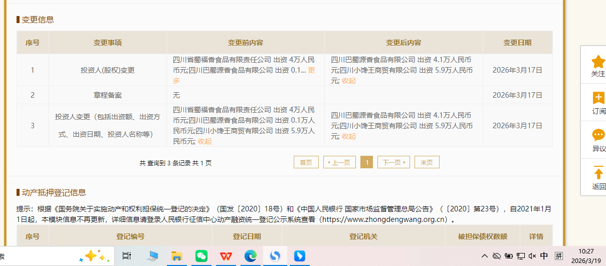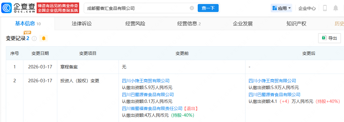 企查查APP显示,3月17日,成都蜀香汇食品有限公司发生工商变更,原股东四川省蜀福香食品有限责任公司退出。