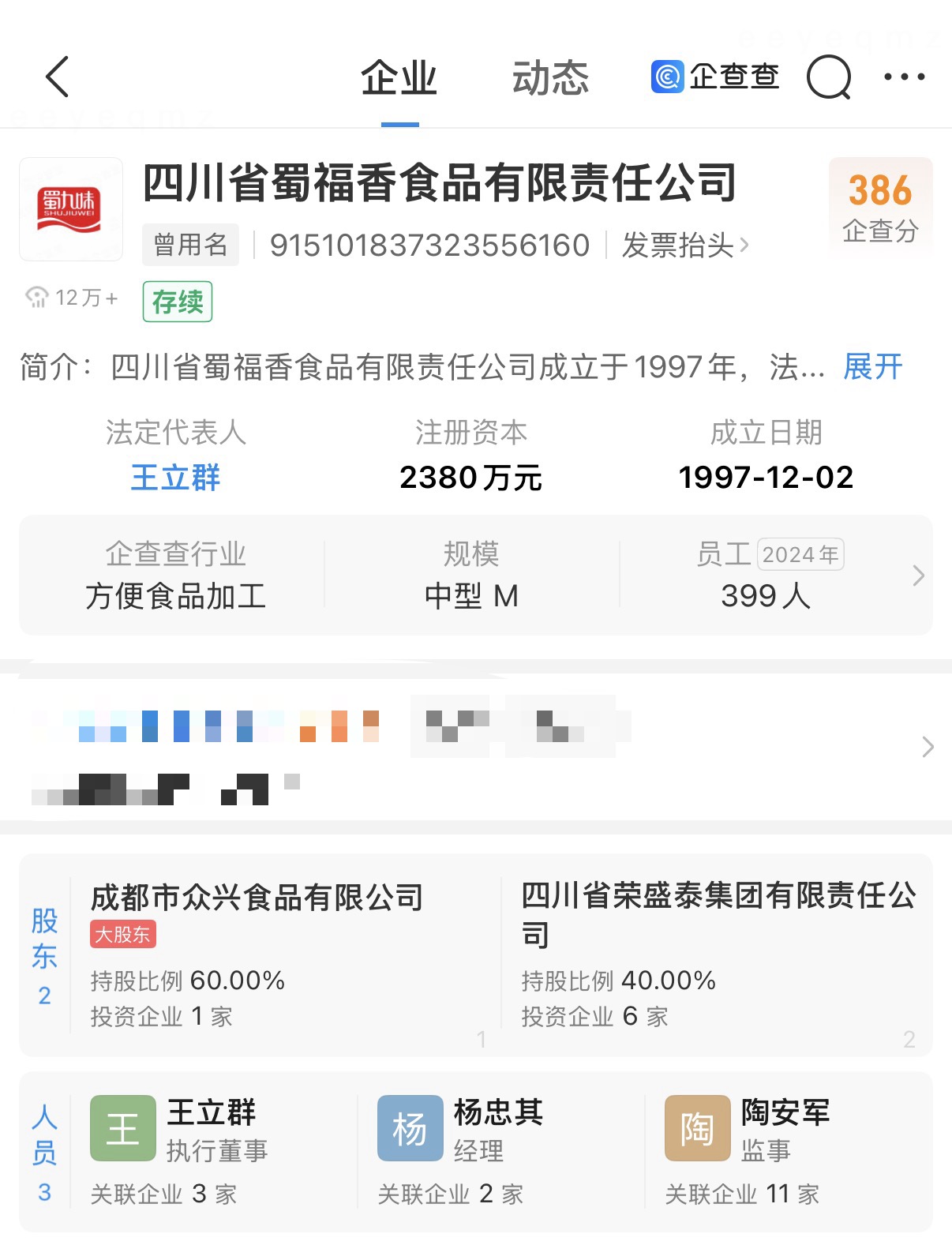 企查查显示,四川省蜀福香食品有限责任公司成立于1997年12月,法定代表人为王立群,注册资本2380万人民币,由成都市众兴食品有限公司、四川省荣盛泰集团有限责任公司共同持股。值得一提的是,目前,该公司已无对外投资公司。
