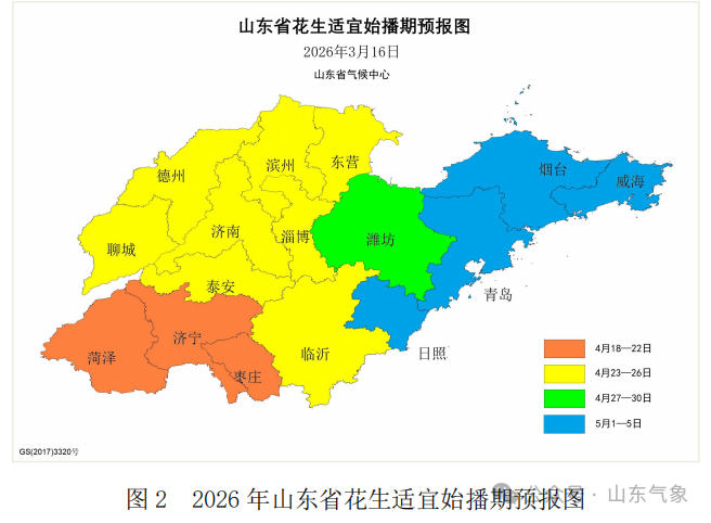 预计2026年全省大部分地区花生适宜始播期接近常年略偏早。菏泽、济宁、枣庄3市为4月18一22日,临沂、济南、泰安、淄博、聊城、德州、滨州、东营8市为4月23-26日,潍坊为4月27一30日,日照、青岛、烟台、威海4市为5月1一5日(图2)。套种花生应在麦收前15~20天播种。