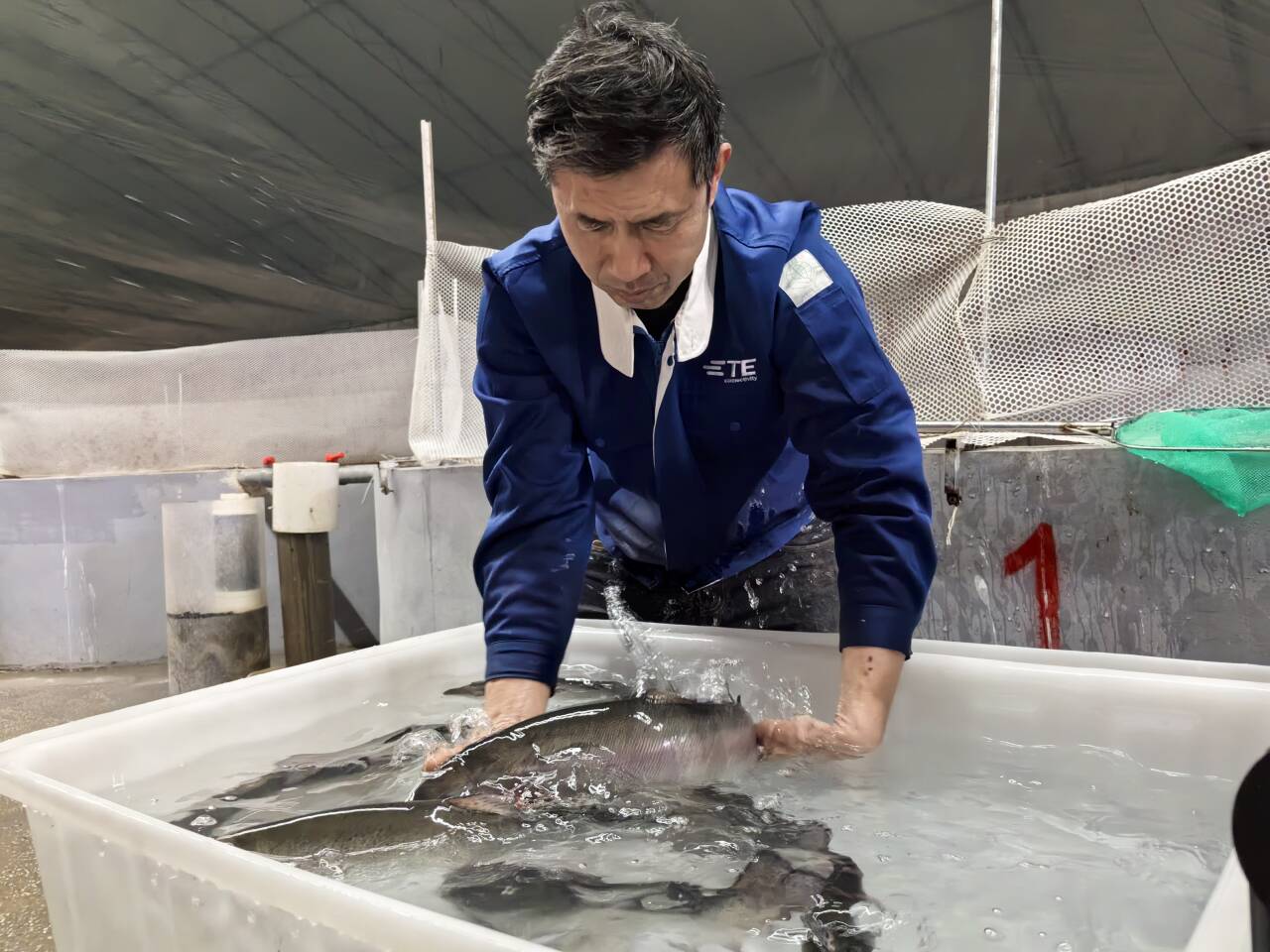 正是靠着这套先进的陆基循环水系统,养殖用水经过物理过滤、生物净化、消毒脱氧等一整套流程处理后,可以实现重复利用,做到了低耗水、低排放的绿色养殖。这套系统不仅解决了传统养殖耗水大的老问题,还给娇贵的三文鱼打造了一个不受外界天气影响的“恒温家园”。在这里,水温、溶氧量、氨氮含量等各项指标都处于可控状态,为三文鱼的健康成长提供了可靠保障。