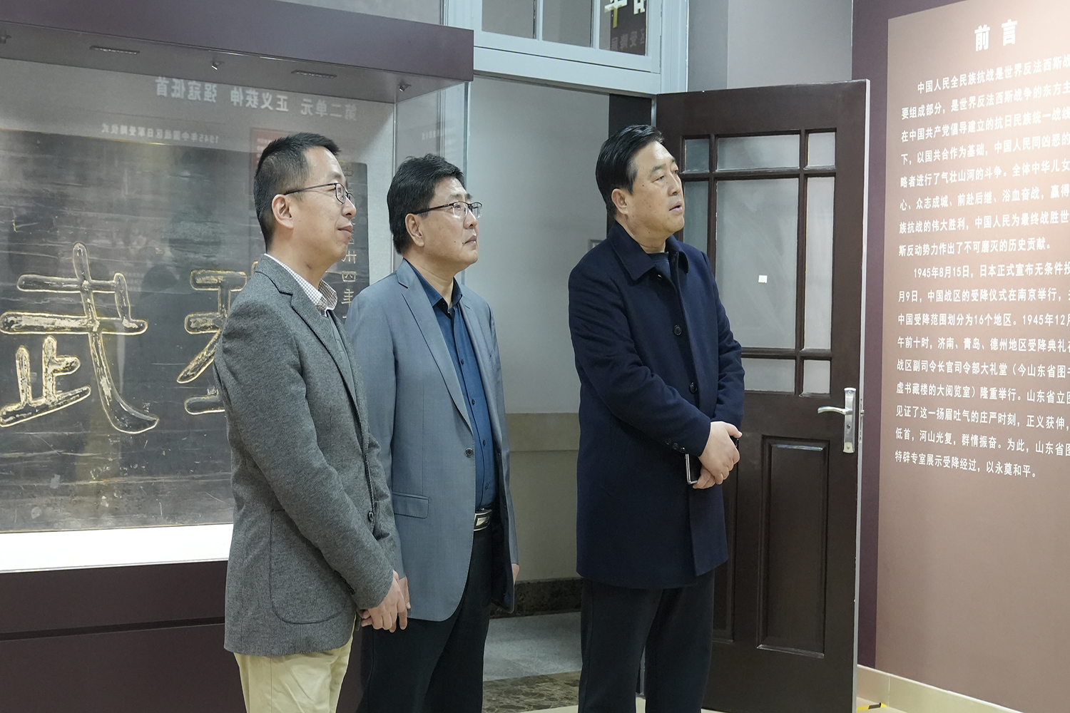 活动伊始,在山东省图书馆党委副书记邢学军的陪同下,首先参观了尼山书院和著名的“奎虚书藏”楼。据介绍,这座楼曾经见证过一桩重大历史事件——1945年12月27日上午,中国人民抗日战争胜利山东战区受降仪式在这座藏书楼内举行。在展厅内,我们见到了见证该历史时刻的重要抗战文物,李延年亲笔书写的“我武维扬”木质匾额。此匾额长2.75米,宽1.11米,重约150公斤。匾额整体涂黑漆,正面“我武维扬”金色大字遒劲有力,右上角字迹为“中华民国卅四年十二月廿七日受降纪念”,左下角落款为“李延年题”。