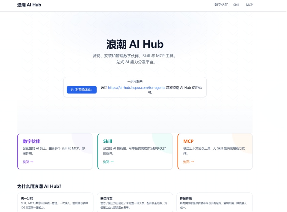 在此背景下,浪潮云正式发布AI Hub技能市场,围绕“开箱即用、本地部署、安全可控”三大核心能力,构建面向政企场景的AI能力统一分发平台,实现“数字伙伴”、Skill与MCP资源集中管理与标准化调用,原生支持OpenClaw等智能体生态,推动AI能力组件从分散向平台化运营转型,构建可沉淀、可复用、可持续演进的智能化能力体系。