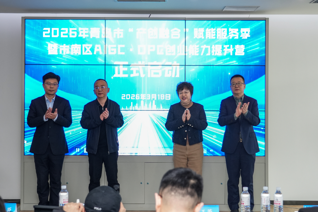 3月18日,由青岛市人力资源和社会保障局指导,市南区人力资源和社会保障局、市南区工业和信息化局主办,青岛市广播电视台(集团)、青岛海诺投资发展有限公司、青岛农商银行市南支行、青岛人才发展集团协办的2026年青岛市“产创融合”赋能服务季暨市南区首期AIGC·OPC创业能力提升营,在青岛AIGC·OPC产业基地正式启幕。市、区相关部门领导、创业导师及参训学员等80余人齐聚一堂,共同见证这场聚焦AIGC数字视听细分赛道、助力OPC产业集聚发展的创业赋能盛会。