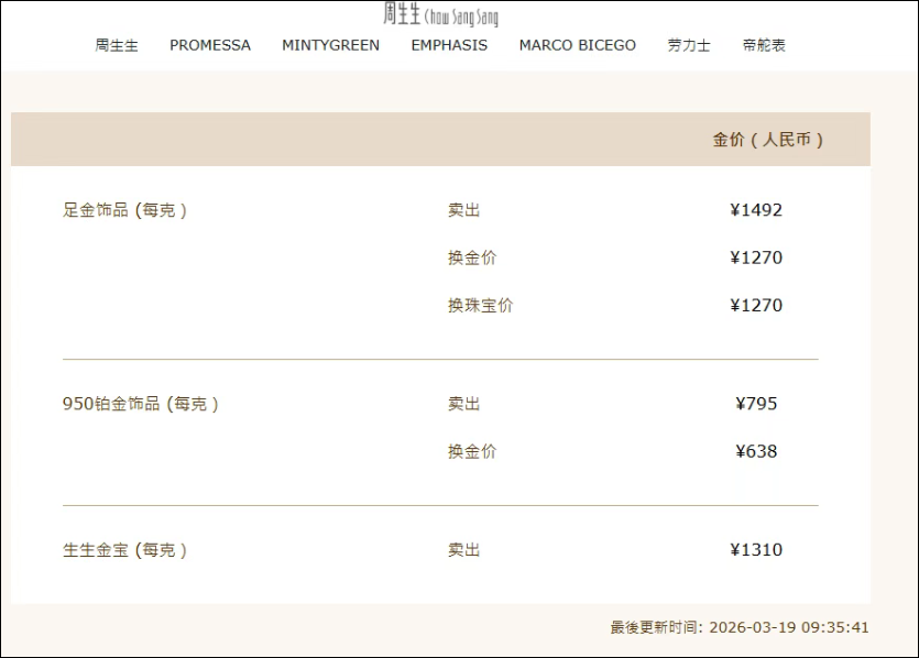 周生生金饰克价1492元,较前一日1547元/克的价格下跌55元/克,相比3月3日的月内高点1650元/克跌158元。