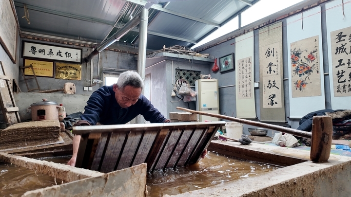 郑友明的抄纸房里,木架、竹帘、石槽错落摆放,空气中弥漫着桑树皮特有的清润草木香,时光仿佛在此沉淀。最考验匠人的“捞纸”环节,没有机器校准,全凭一双大手、一双慧眼和数十年练就的手感把控,竹帘入浆的深浅、手腕起落的轻重、摆动的幅度与速度,差之毫厘,纸质便谬以千里。他介绍,桑皮纸制作需要一气呵成,竹帘探入浆池,手腕轻旋、力道匀停,一沉一抬、左右轻荡,薄如蝉翼的纸膜便稳稳附着在竹帘之上,整套动作需要行云流水,要有点功力才能完成。
