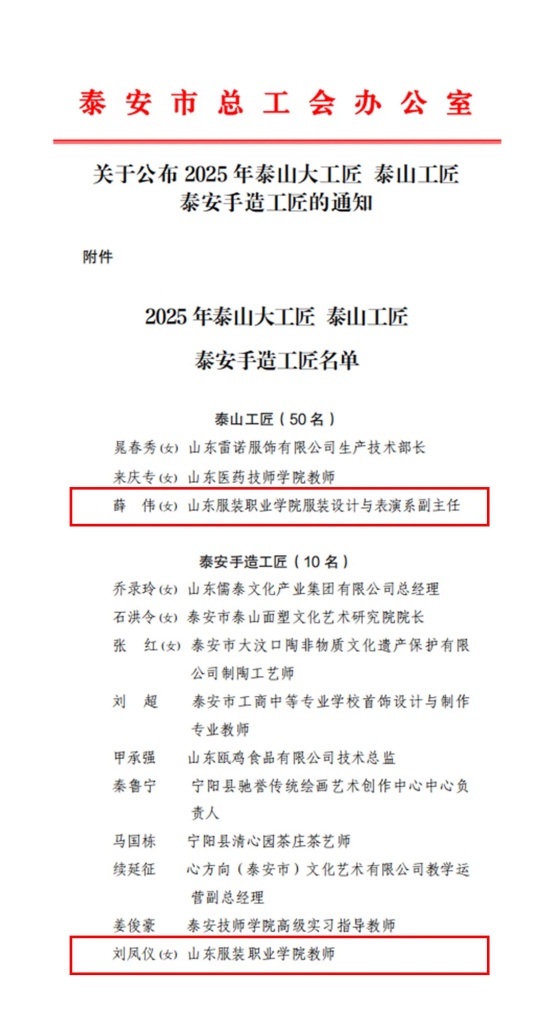 2025年“泰山工匠”“泰安手造工匠”名单正式公布,山东服装职业学院两位教师凭借精湛的专业技艺、深耕一线的执着坚守与匠心育人的突出贡献成功入选,其中薛伟荣获“泰山工匠”称号,刘凤仪荣获“泰安手造工匠”称号。