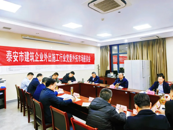 为深入贯彻落实山东省住房城乡建设厅以及泰安市委、市政府关于坚定不移实施建筑业“走出去”发展战略、全面拓展省内、省外及海外三大市场的部署要求,泰安市建筑企业外出施工行业党委借助全省建筑企业外出施工行业党务工作者培训契机,组织召开外拓市场专题座谈会。