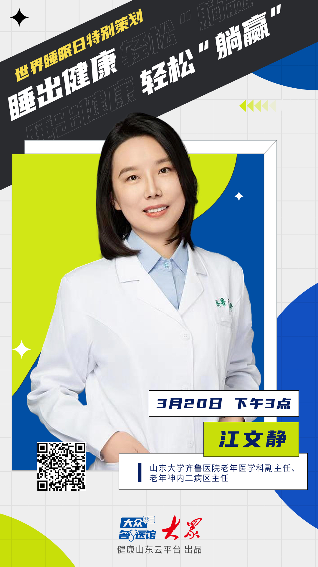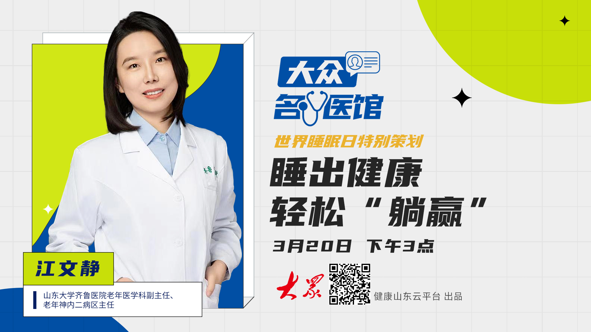 3月21日是世界睡眠日,今年的主题是“优质睡眠,美好生活”。3月20日下午3点,《大众名医馆》特别邀请到山东大学齐鲁医院老年医学科副主任,老年神内二病区主任江文静,带领大家从科学认知到健康实践,帮助每一位观众睡出健康、睡出活力、睡出美好生活。