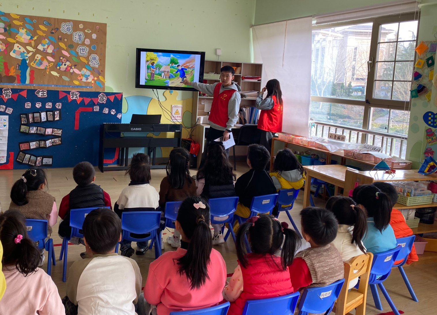 活动现场暖意氤氲、童趣盎然,明亮的教室里,孩子们端端正正坐成一排,小脸上满是期待。志愿者们化身“故事大王”,手持色彩鲜艳、图文并茂的雷锋故事绘本,用温柔亲切、通俗易懂的语调,缓缓开启了雷锋叔叔的故事之旅。孩子们听得全神贯注,小脑袋微微前倾,一双双明亮的眼睛紧紧追随着志愿者的身影,眼里闪烁着好奇与敬佩的光芒。