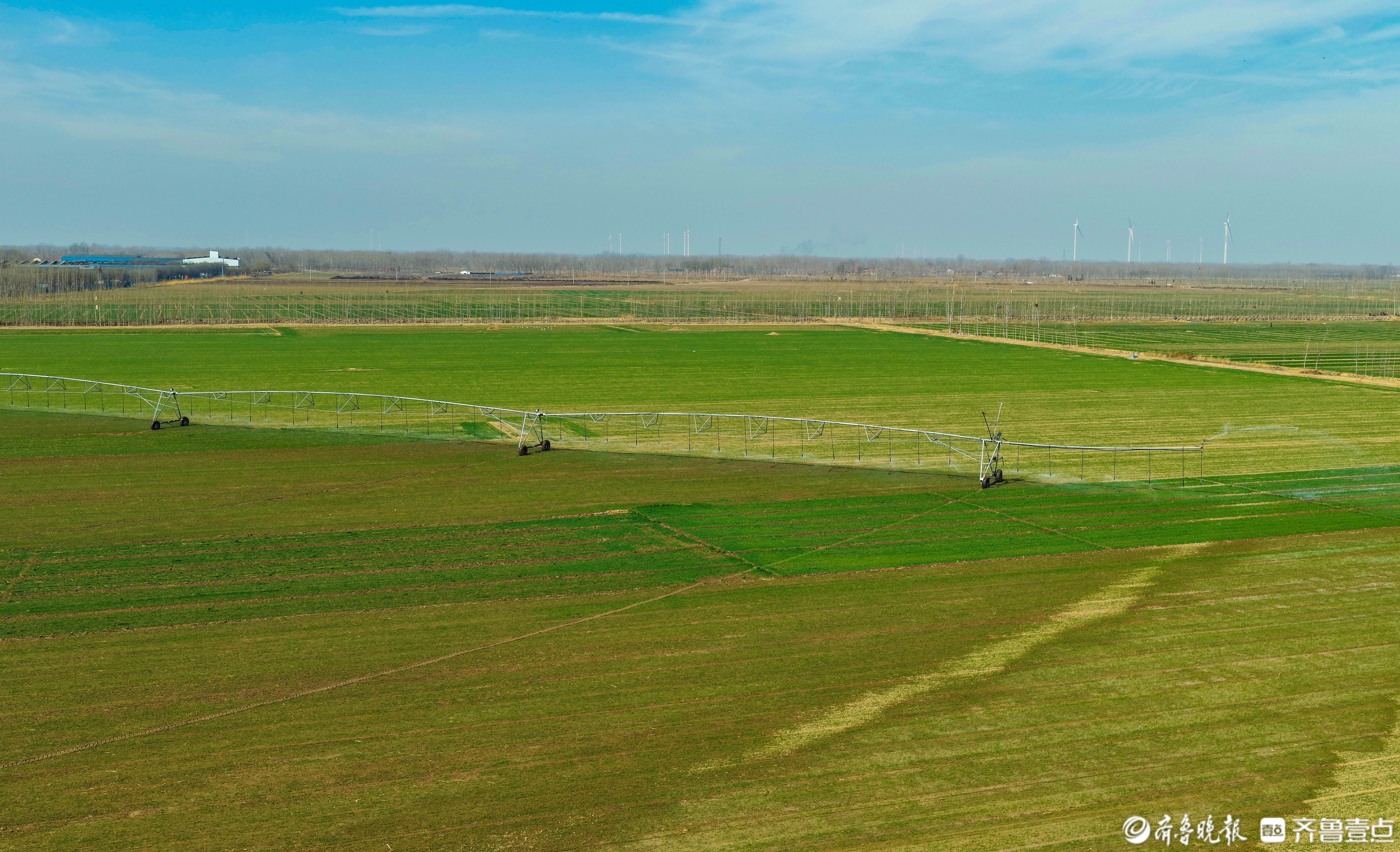 3月19日,山东省乐陵市黄夹镇德鑫生态种植家庭农场运用自走指针式喷灌设备给小麦浇水。