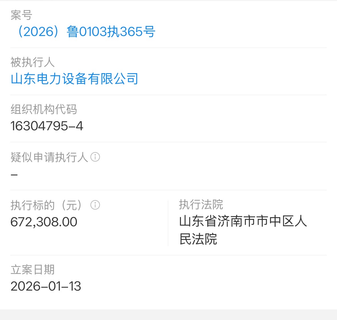 经济导报记者查询发现,山东电工电气集团全资子公司——山东电力设备有限公司今年1月13日被济南市市中区人民法院列为被执行人,执行标的67.23万元。