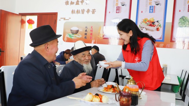 近日,党员志愿者在阿合奇县阿合奇镇友谊路社区老年人日间照料中心老年食堂提供就餐服务。近年来,阿合奇县积极探索“党建+”养老服务模式,加大推进老年食堂建设力度,把老年食堂打造成群众家门口的“幸福驿站”。古丽加马力·艾萨摄