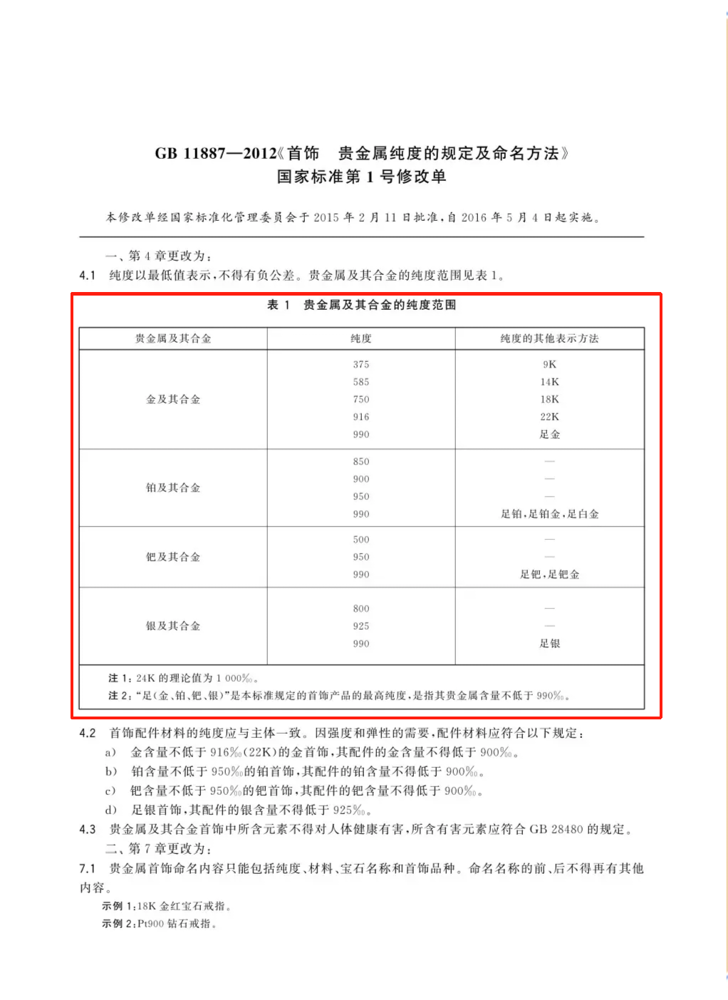 足金、足银:纯度最低值为990‰;22K金:纯度最低值为916‰;18K金:纯度最低值为750‰。