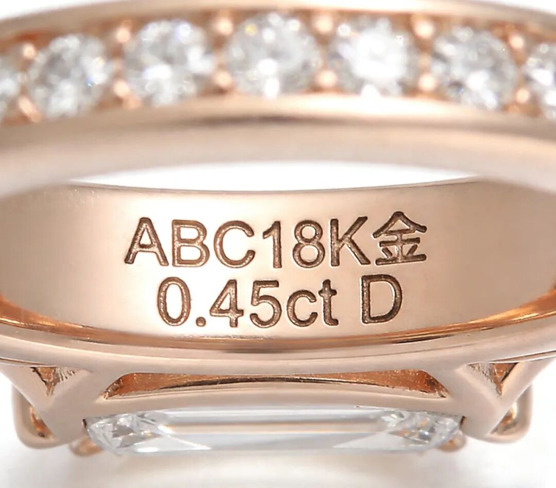 印记查验要点:每件合格的金银饰品上都必须有永久性印记(打印或刻印),印记内容包含以下信息:厂家代号、材料、纯度以及镶钻首饰主钻石(0.10克拉以上)的质量。
