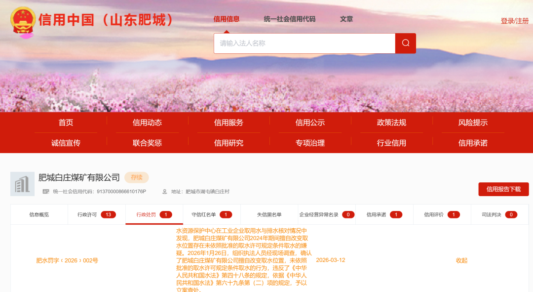 近日,肥城市水利局对肥城白庄煤矿有限公司作出行政处罚,罚款50000元。