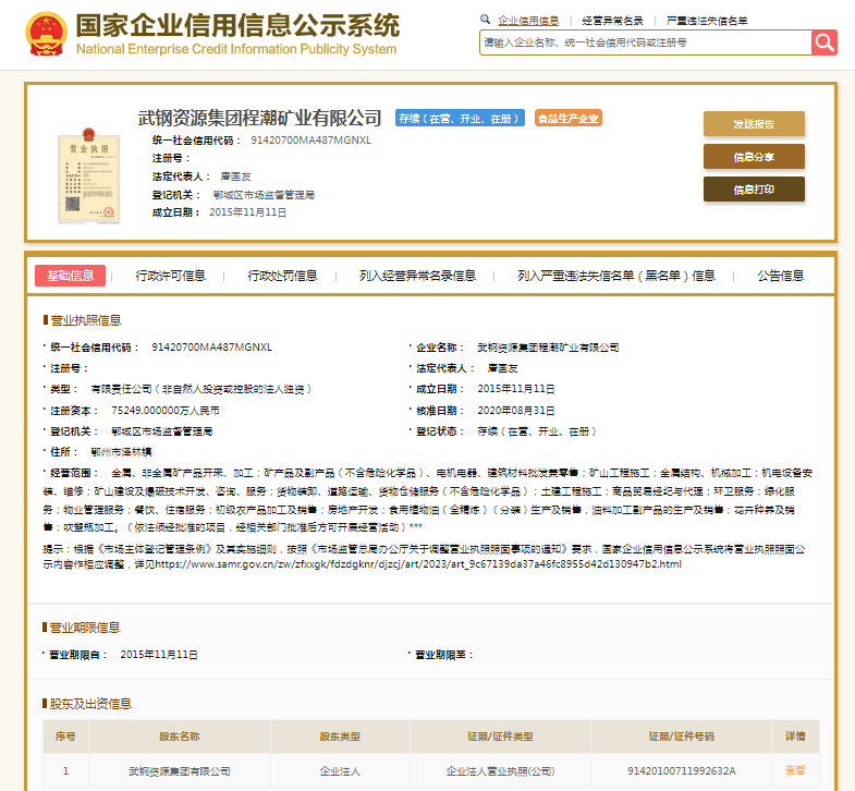 国家企业信用信息公示系统显示,武钢资源集团程潮矿业有限公司成立于2015年,注册资本75249万元人民币,法定代表人为唐国友,由武钢集团全资子公司——武钢资源集团有限公司全资持股。