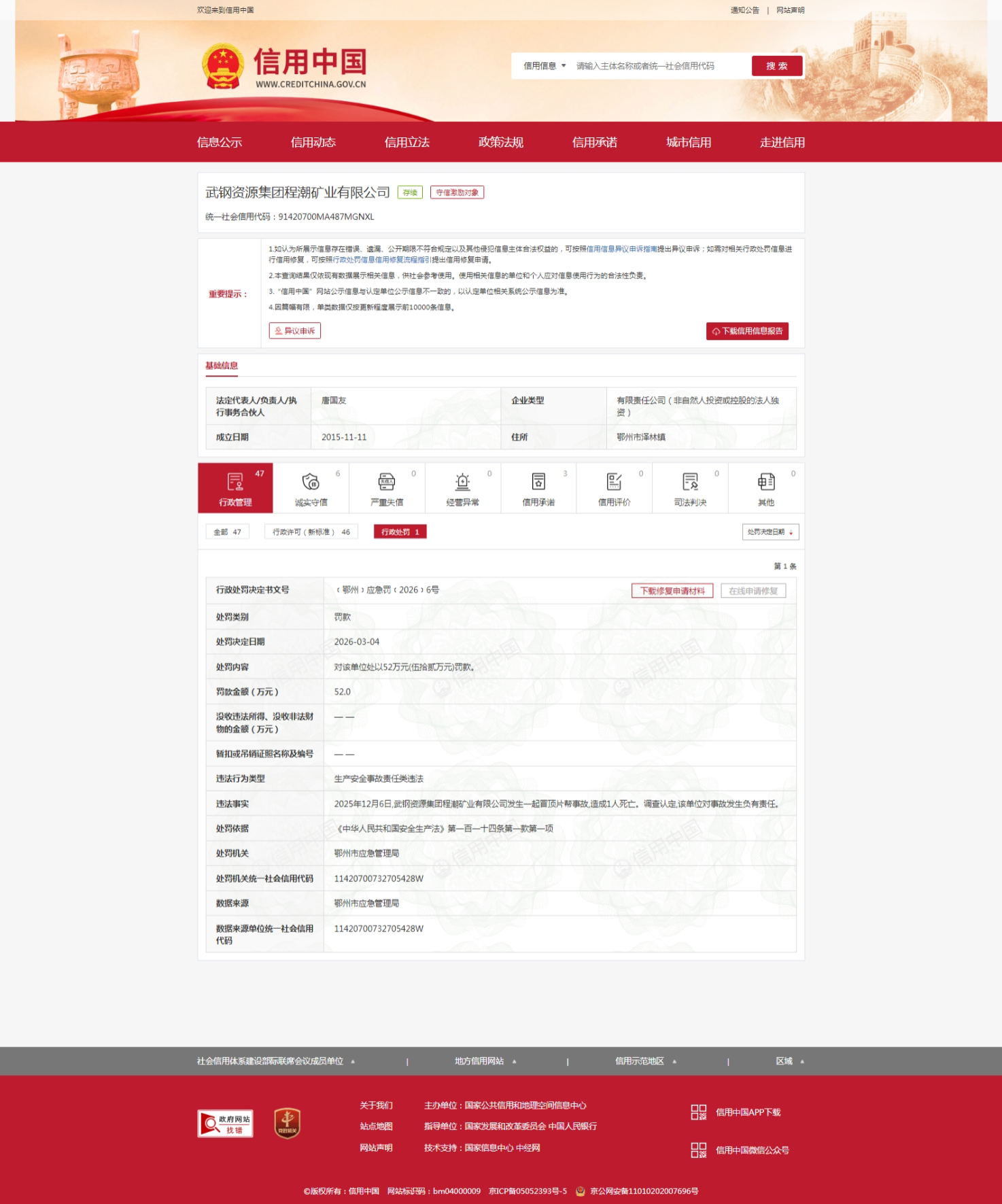 内容显示,武钢资源程潮矿业的违法事实是:2025年12月6日,该公司发生一起冒顶片帮事故,造成1人死亡。调查认定,该单位对事故发生负有责任。