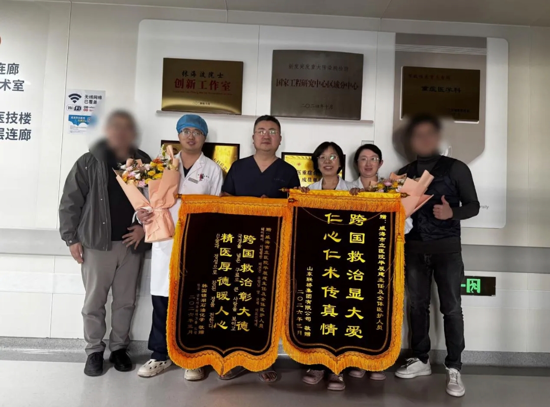 近日,已平安返回韩国的患者,与其就职的韩国锦湖集团携手,特意委托威海合作伙伴联桥集团,为毕展建主任及急危重症综合科全体医务人员送来鲜花与两面鲜红的锦旗,锦旗上“跨国救治显大爱、仁心仁术传真情”“跨国救治彰大德、精医厚德暖人心”的字样,既是对救治团队的诚挚谢意与高度认可,更是这场跨越国界生命接力的珍贵见证。