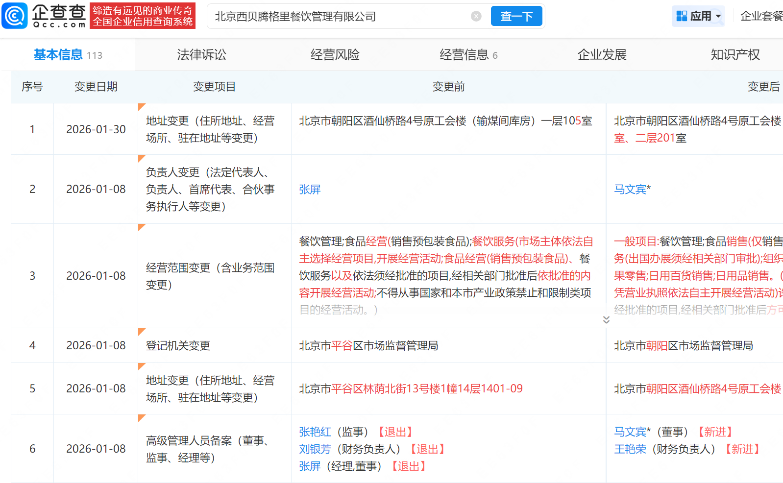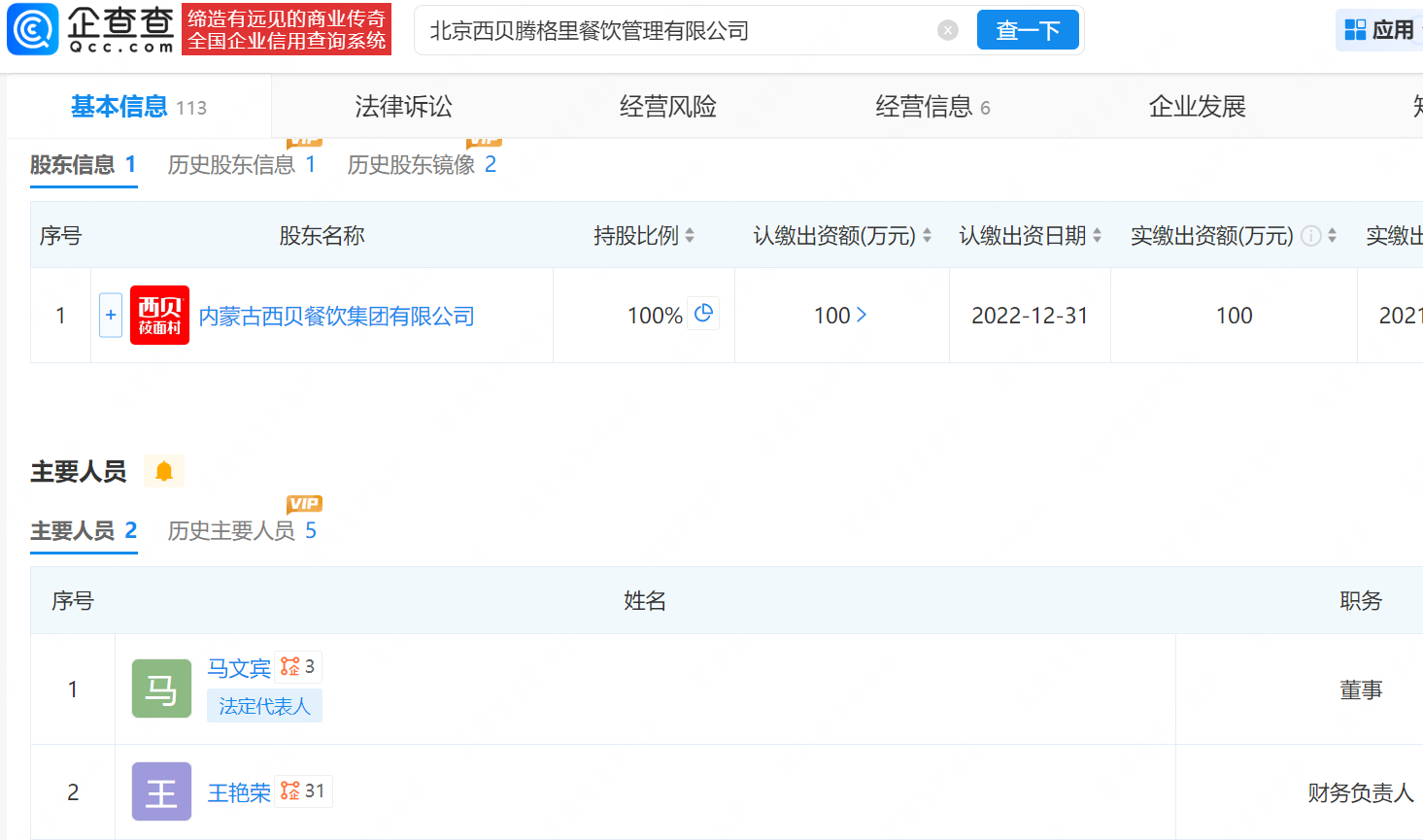 企查查APP显示,北京西贝腾格里餐饮管理有限公司成立于2021年11月,法定代表人为马文宾,注册资本为100万元,经营范围包含餐饮管理、食品销售(仅销售预包装食品)、餐饮服务等,由内蒙古西贝餐饮集团有限公司全资持股。