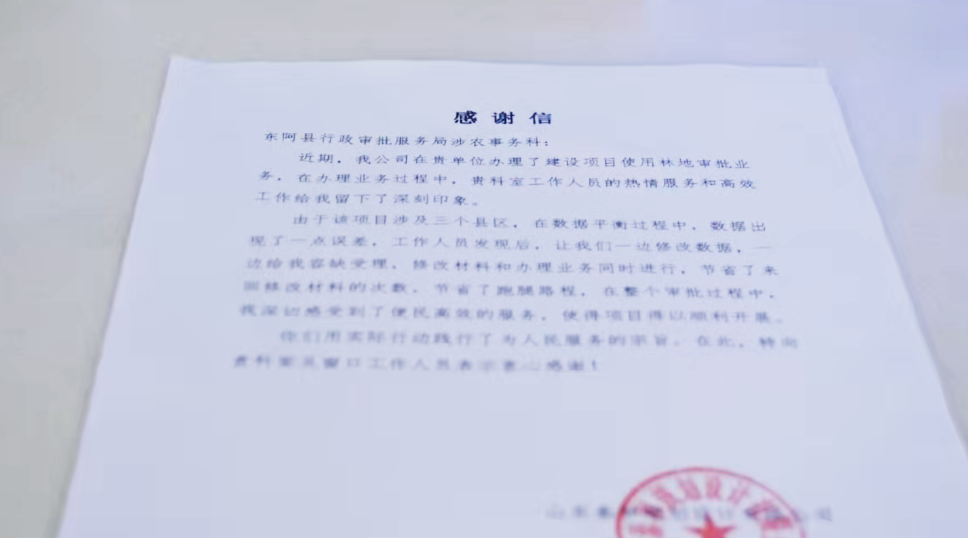 “多亏了工作人员全程指导、贴心服务,我们的林地手续才得以快速办结,让我们少跑腿、好办事,为项目早日开工赢得了宝贵时间,真切感受到了东阿营商环境的速度与温度。”3月14日,东阿县行政审批服务局收到了来自威海的一家企业的感谢信,信中山东泰和规划设计有限公司副总经理丛科对东阿县行政审批服务局高效贴心的林地审批服务表达了诚挚感谢。