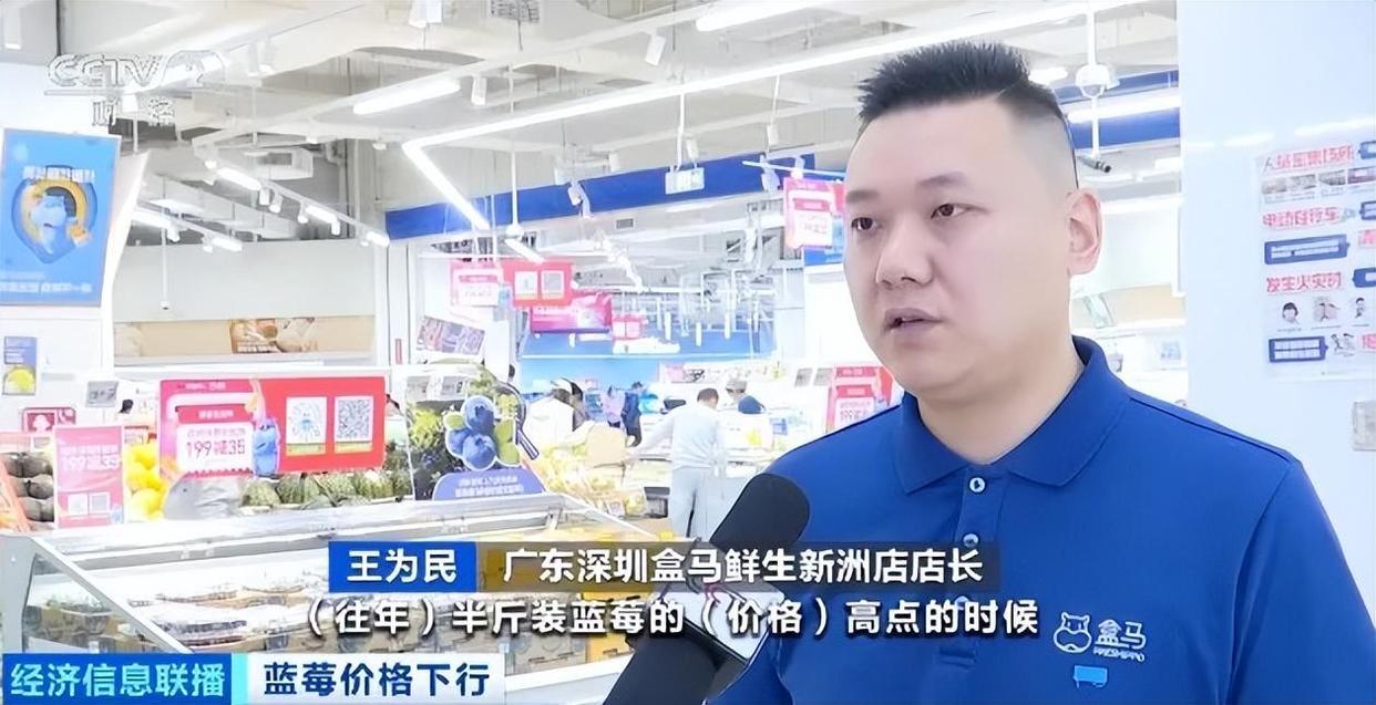 广东深圳盒马鲜生新洲店店长 王为民:往年半斤装蓝莓价格高的时候是将近30元,目前是19.9元。对比去年同期销量增长20%。