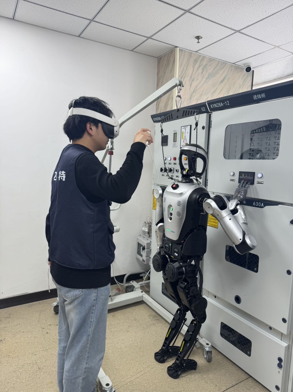 在赛飞特的机器人训练室,一名工作人员头戴VR眼镜式的设备,手握遥控器。随着他按下按钮,一旁的机器人同步做出动作,手指准确按在配电箱的按钮上。