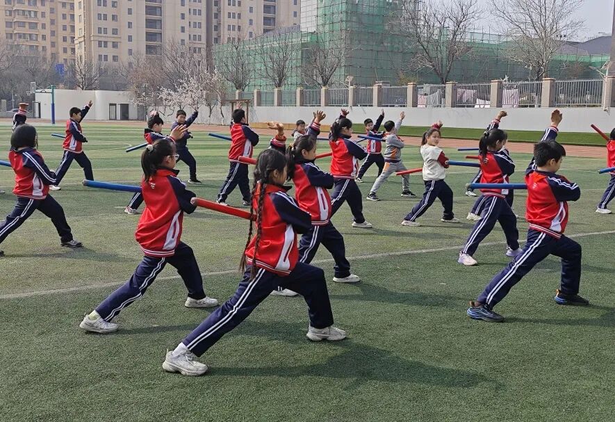 济南市槐荫区锦绣城小学创新体育课教学,每周开设一节武术必修课,开展武术套路、短兵等教学,并成立武术社团与精英队,实现普及与提升并重,传承中华武术文化,全面提升学生身体素质与体育素养。