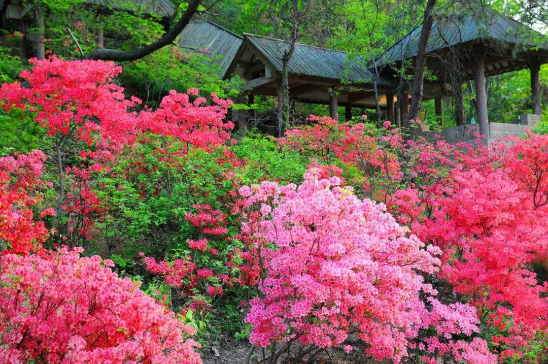 盛花:4月中下旬,迎红杜鹃开成海,与奇峰古寺相映成画