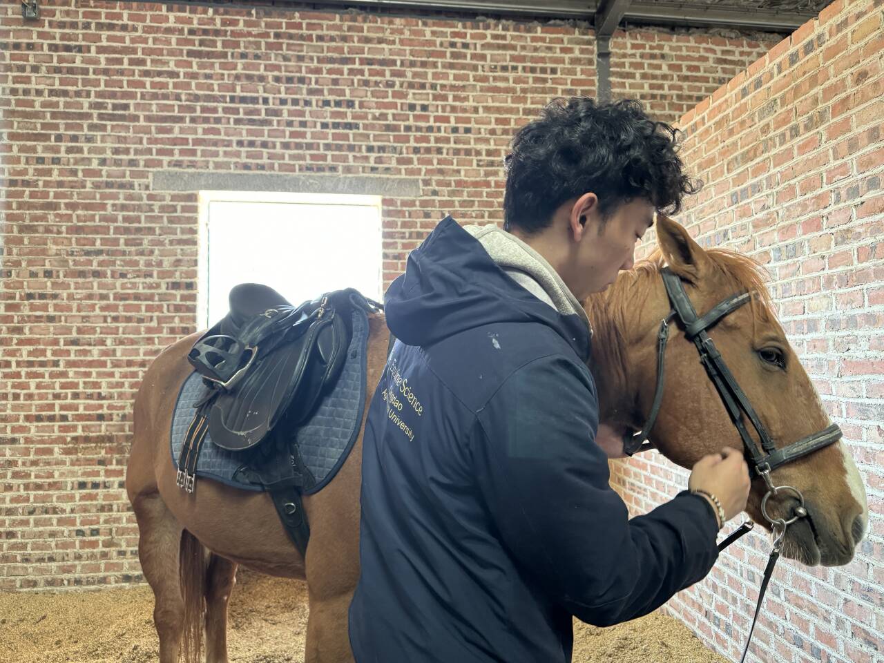 青岛农业大学马业科学专业学生在马场给马儿刷毛