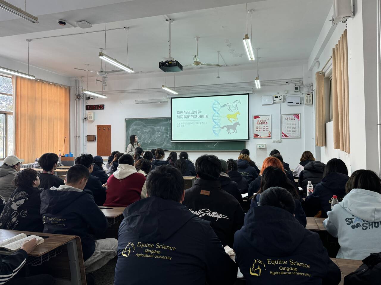 青岛农业大学动物科技学院马业科学专业老师孟元给学生讲解马匹毛色遗传学知识