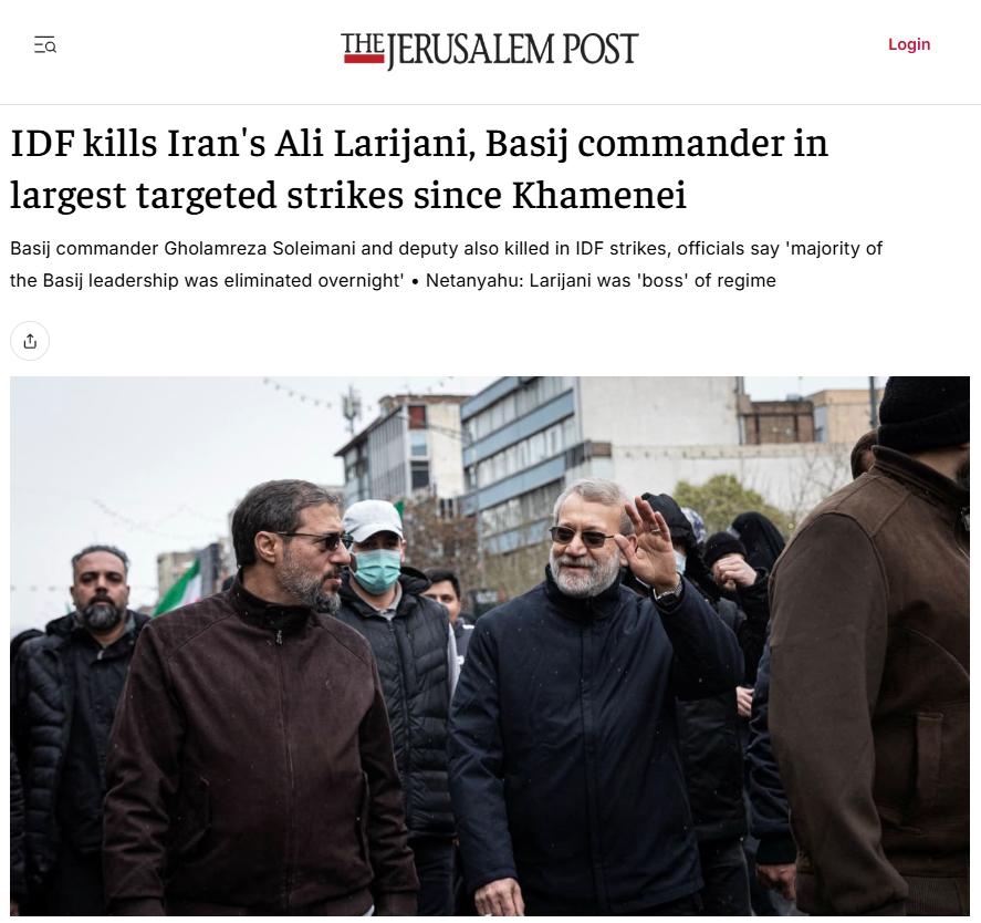 这被以色列解读为继前最高领袖哈梅内伊遇害后,以色列实施的最重大的一次“定点清除行动”。以方认为,2月28日之后,拉里贾尼领导了针对以色列和美国的作战行动,是伊朗“事实上的领导人”。